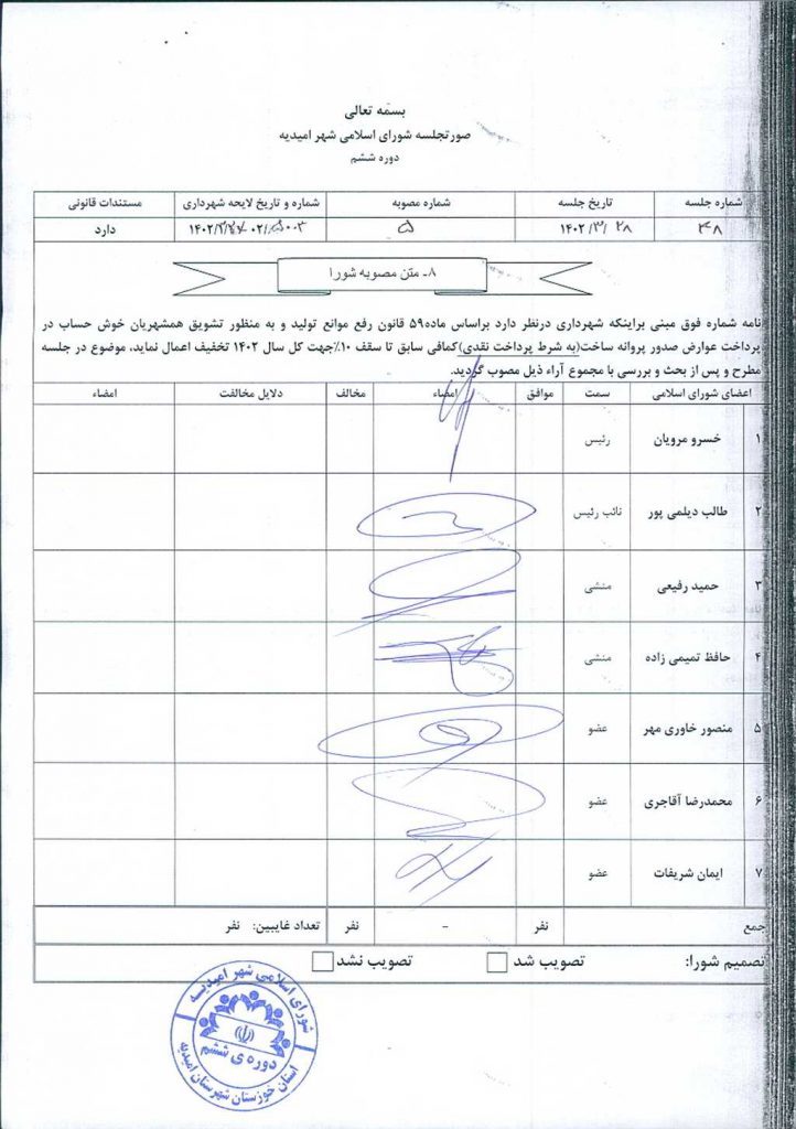 مصوبه شماره ۵ جلسه شماره ۴۸ شورای اسلامی شهر امیدیه