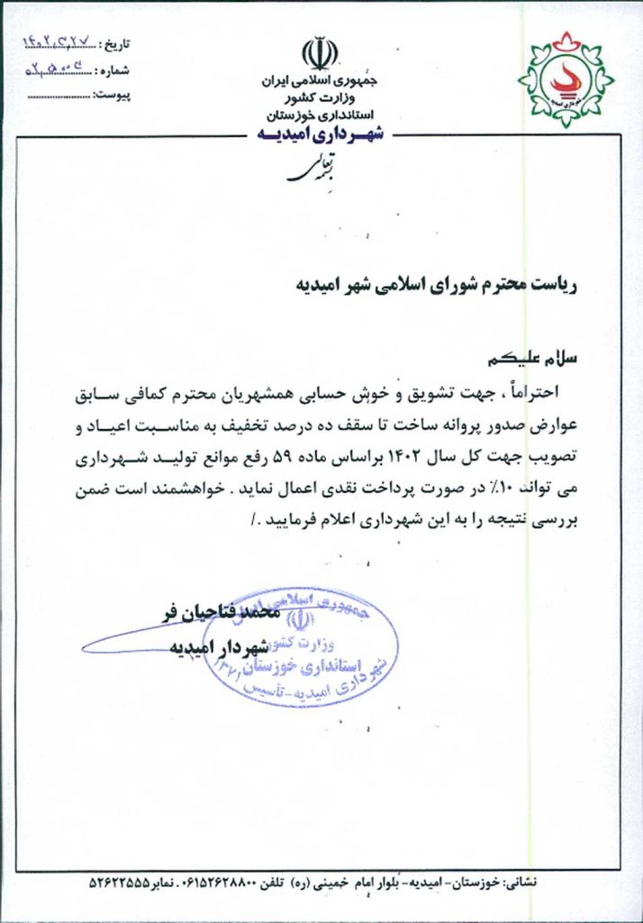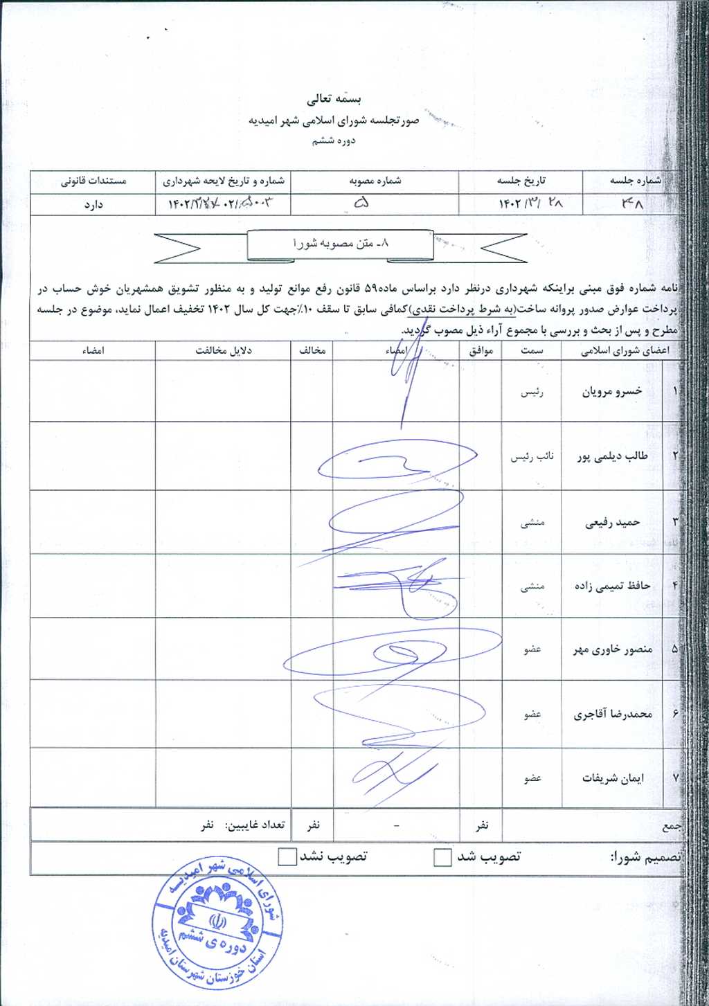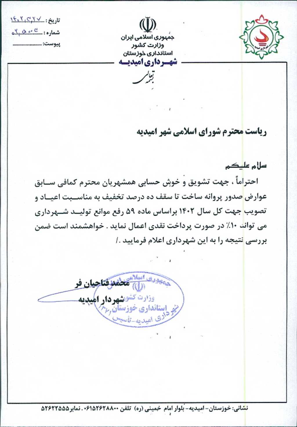 نامه شماره فوق مبنی براینکه شهرداری درنظر دارد براساس ماده۵۹ قانون رفع موانع تولید و به منظور تشویق همشهریان خوش حساب در پرداخت عوارض صدور پروانه ساخت(به شرط پرداخت نقدی)کمافی سابق تا سقف ۱۰% جهت کل سال ۱۴۰۲ تخفیف اعمال نماید، موضوع در جلسه مطرح و پس از بحث و بررسي با مجموع آراء ذيل مصوب گرديد.