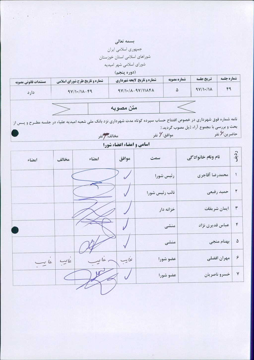 مصوبه شماره ۵ جلسه شماره ۴۹ مورخ ۹۷/۱۰/۱۸ شورای اسلامی شهر امیدیه