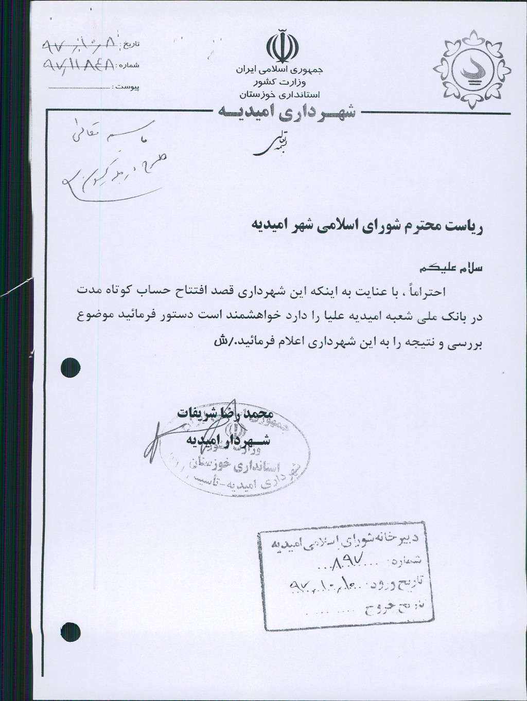 نامه شماره فوق شهرداری در خصوص افتتاح حساب سپرده کوتاه مدت شهرداری نزد بانک ملی شعبه امیدیه علیاء در جلسه مطرح و پس از بحث و بررسی با مجموع آراء ذیل مصوب گردید%
