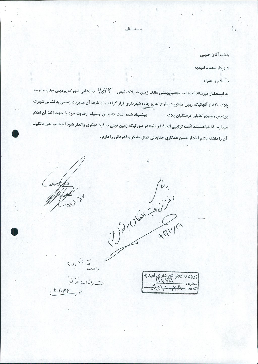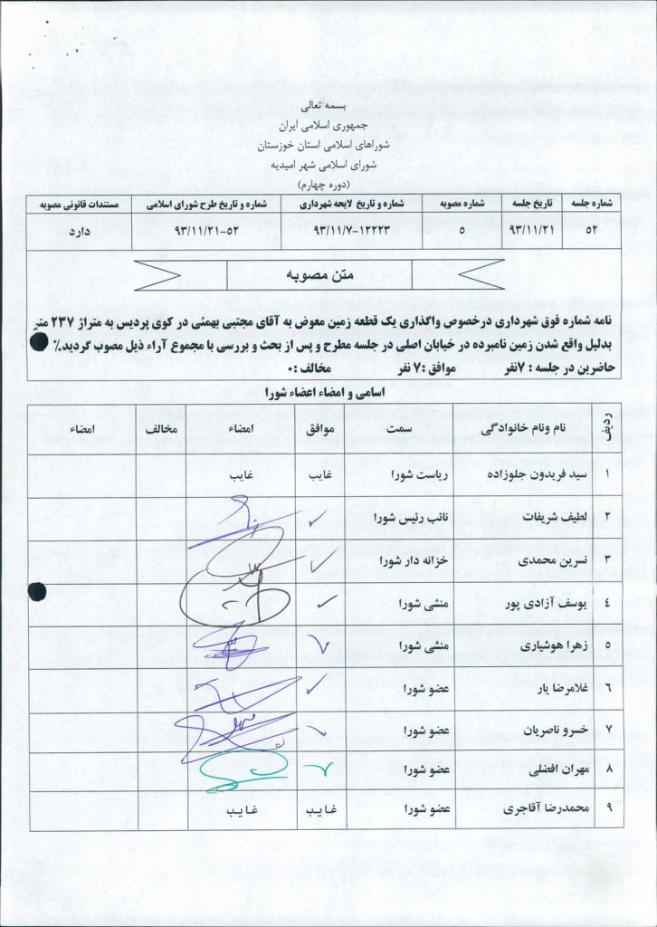 نامه شماره فوق شهرداری درخصوص واگذاری یک قطعه زمین معوض به آقای مجتبی بهمئی در کوی پردیس به متراژ ۲۳۷ متر بدلیل واقع شدن زمین نامبرده در خیابان اصلی در جلسه مطرح و پس از بحث و بررسی با مجموع آراء ذیل مصوب گردید%