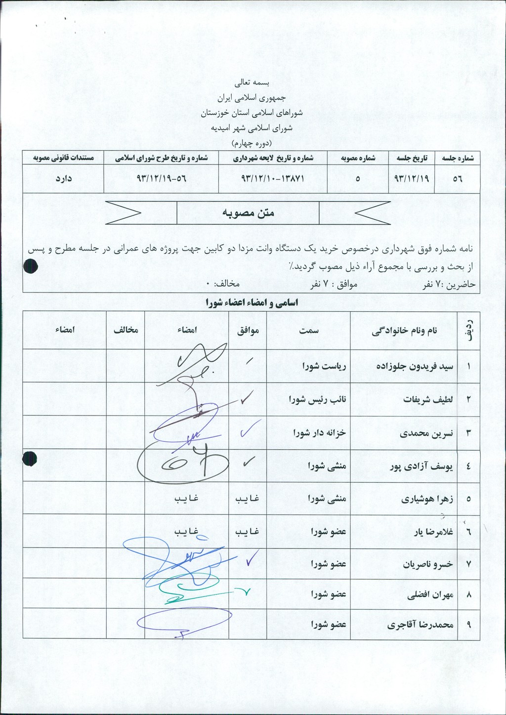 نامه شماره فوق شهرداری درخصوص خرید یک دستگاه وانت مزدا دو کابین جهت پروژه های عمرانی در جلسه مطرح و پس از بحث و بررسی با مجموع آراء ذیل مصوب گردید%