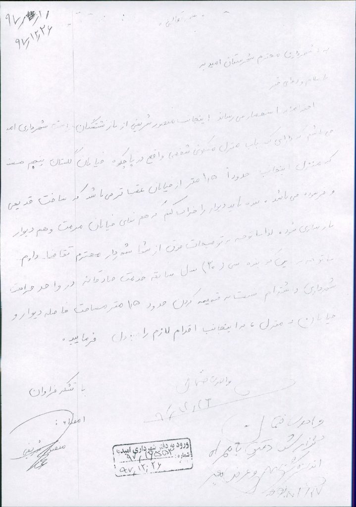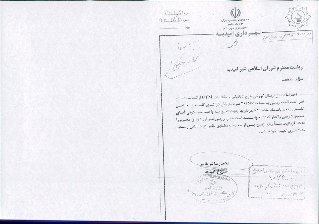 نامه شماره فوق مبنی بر اینکه، شهرداری در نظر دارد قطعه زمینی به مساحت ۵۶/۳۶ مترمربع واقع در کوی گلستان، خیابان گلستان پنجم باستناد ماده ۱۹ شهرداری ها جهت الحاق به واحد مسکونی آقای منصور شریفی طبق کروکی طرح پیوستی، با مختصات UTM ارائه شده واگذار نماید، در جلسه مطرح و پس از بحث و بررسی با مجموع آراء ذیل مصوب گردید.