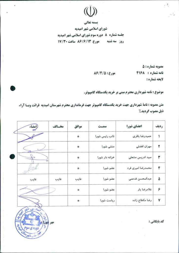 مصوبه شماره ۵ جلسه شماره ۸ مورخ ۸۶/۶/۱۳ شورای اسلامی شهر امیدیه
