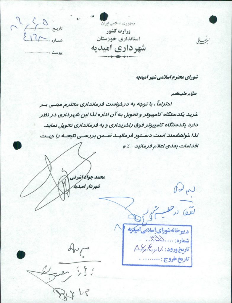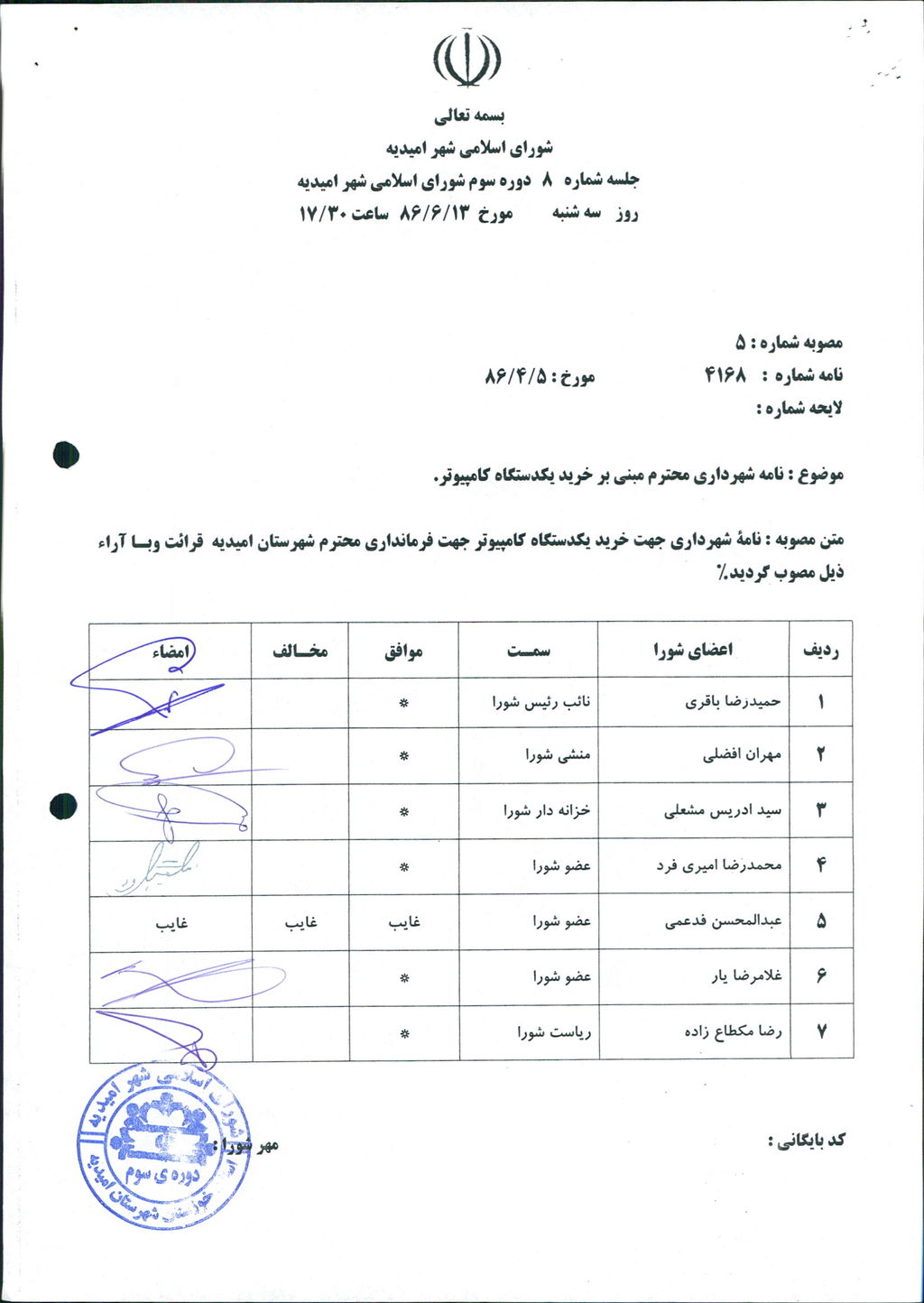 متن مصوبه : نامة شهرداري جهت خريد يكدستگاه كامپيوتر جهت فرمانداري محترم شهرستان اميديه قرائت وبا آراء ذيل مصوب گرديد%