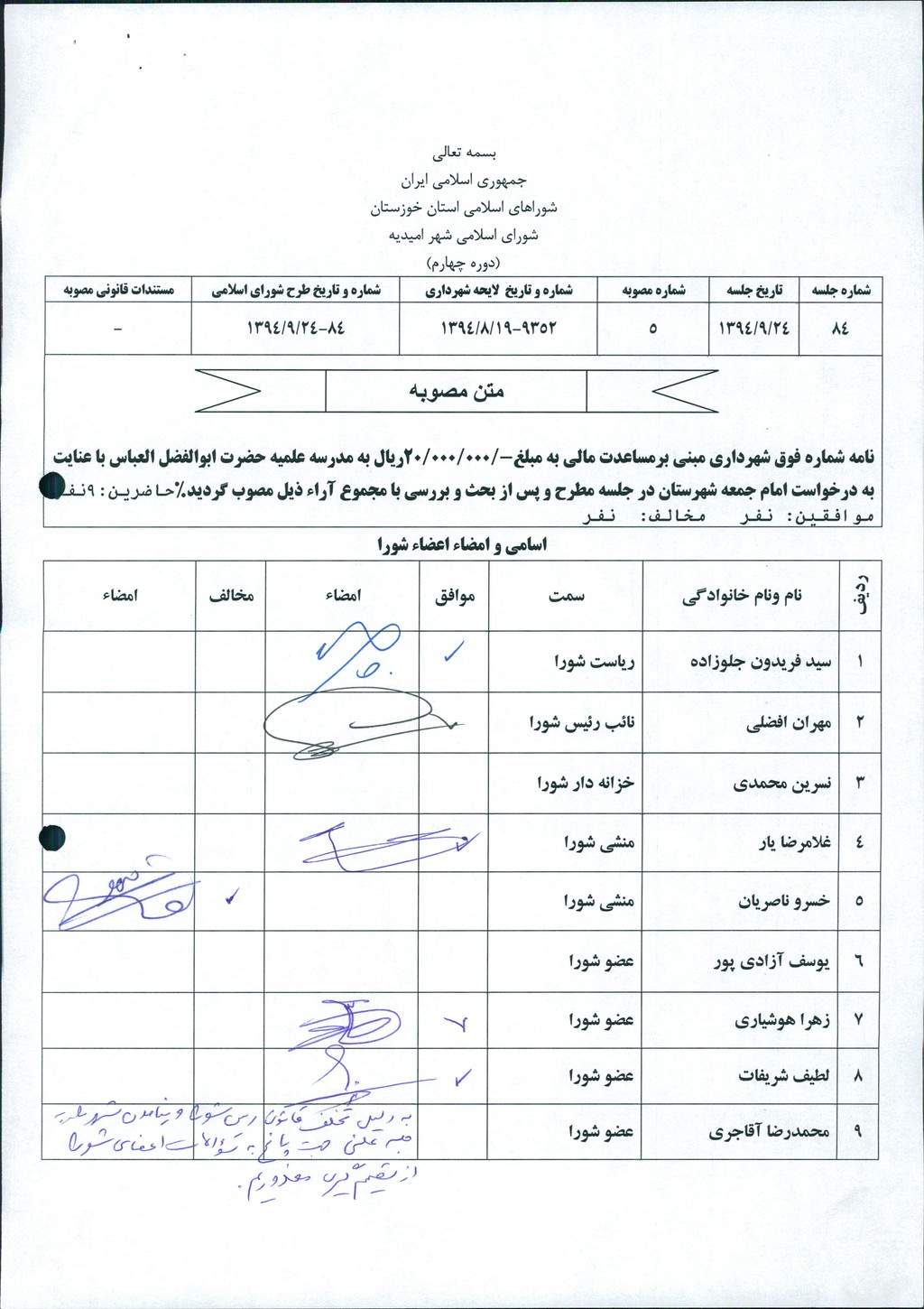 مصوبه شماره ۵ جلسه شماره ۸۴ شورای اسلامی شهر امیدیه