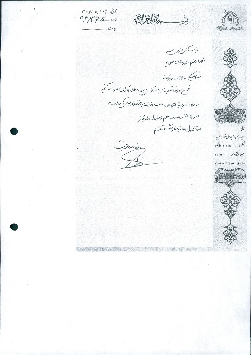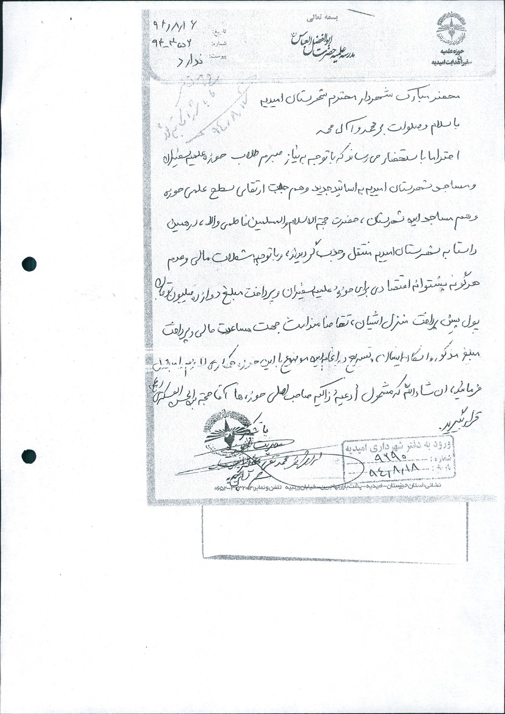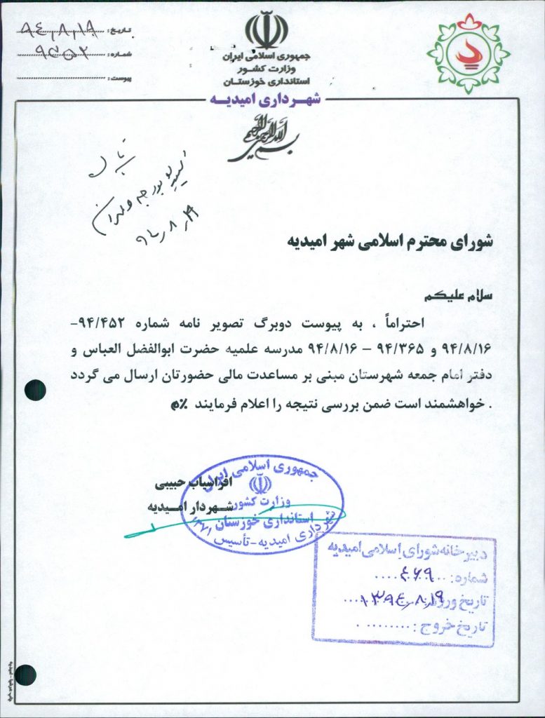 نامه شماره فوق شهرداری مبنی برمساعدت مالی به مبلغ ۲۰۰۰۰۰۰۰ ريال به مدرسه علمیه حضرت ابوالفضل العباس با عنایت به درخواست امام جمعه شهرستان در جلسه مطرح و پس از بحث و بررسی با مجموع آراء ذیل مصوب گردید%