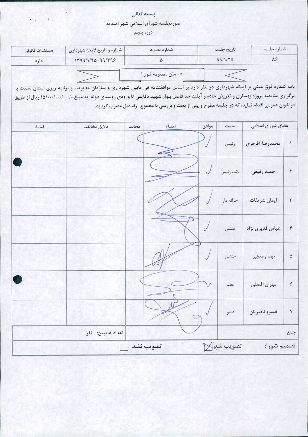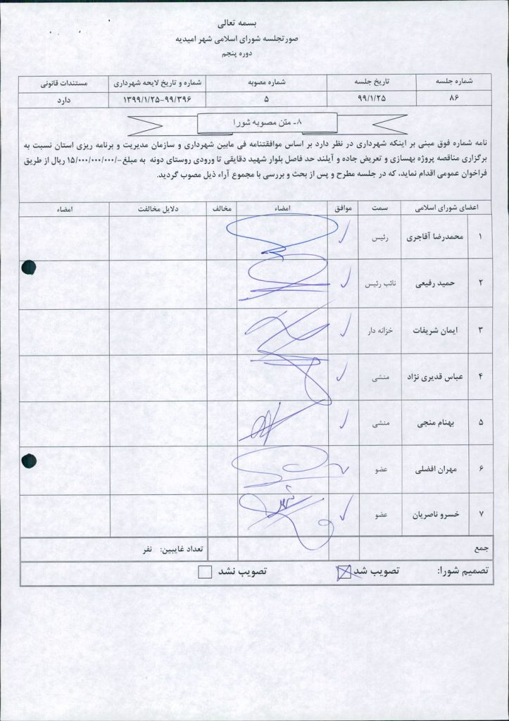 مصوبه شماره ۵ جلسه شماره ۸۶ مورخ ۹۹/۱/۲۵ شورای اسلامی شهر امیدیه