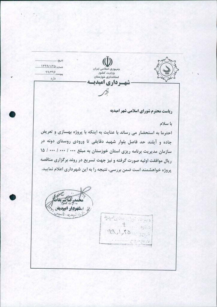 نامه شماره فوق مبنی بر اینکه شهرداری در نظر دارد بر اساس موافقتنامه فی مابین شهرداری و سازمان مدیریت و برنامه ریزی استان نسبت به برگزاری مناقصه پروژه بهسازی و تعریض جاده و آیلند حد فاصل بلوار شهید دقایقی تا ورودی روستای دونه  به مبلغ ۱۵۰۰۰۰۰۰۰۰۰  ريال از طریق فراخوان عمومی اقدام نماید، که در جلسه مطرح و پس از بحث و بررسی با مجموع آراء ذیل مصوب گردید.