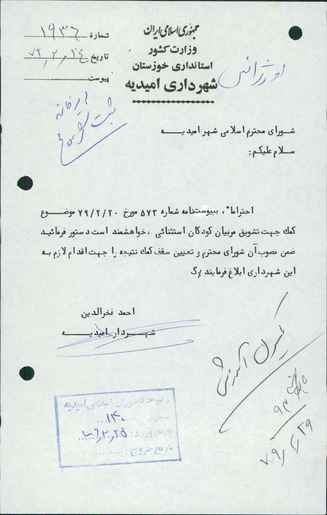 ۵-نامه شماره ۱۹۳۶مورخ ۲۴/ ۲/ ۷۹شهرداري در خصوص درخواست كمك مدرسه كودكان استثنايي مطرح گرديد و با تعداد ۶ رأي مخالف به تصويب نرسيد و علت مخالفت اين بود كه در صورت كمك در بعد عمراني مدارس صورت پذيرد.