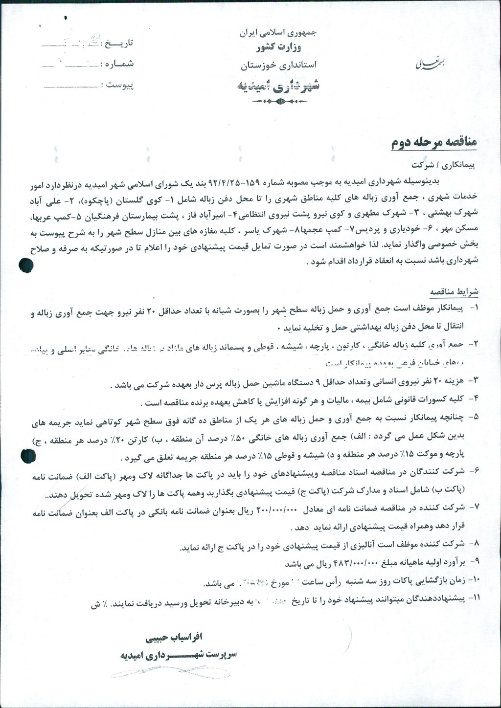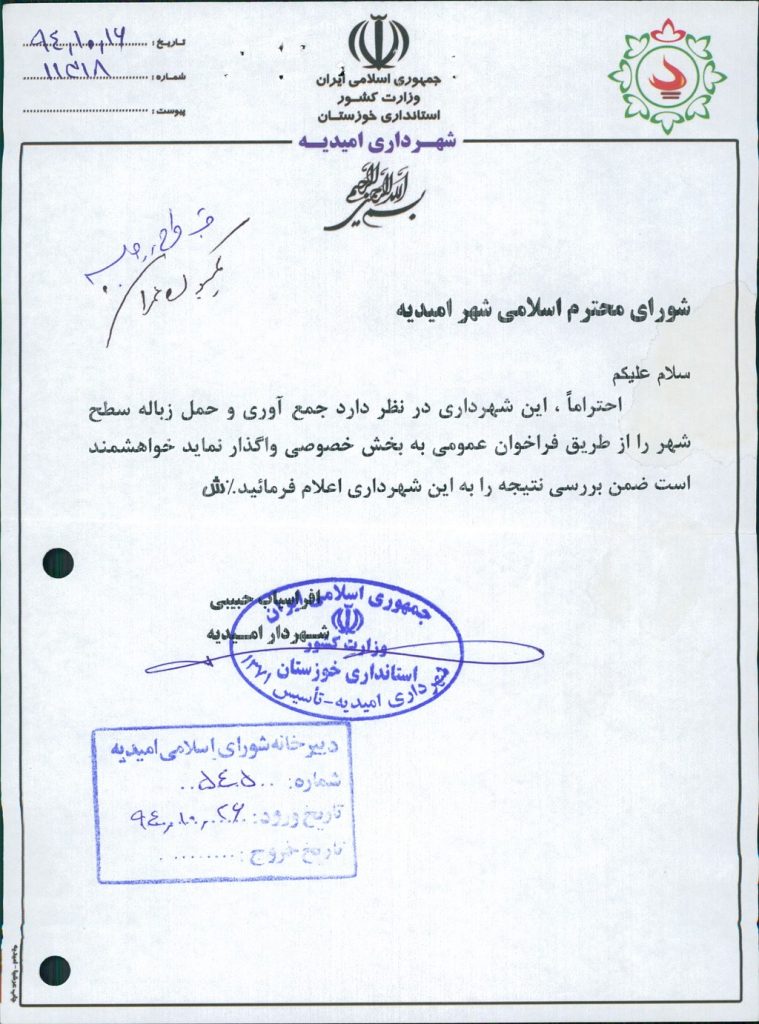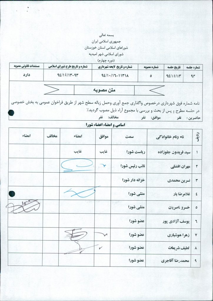 مصوبه شماره ۵ جلسه شماره ۹۳ شورای اسلامی شهر امیدیه