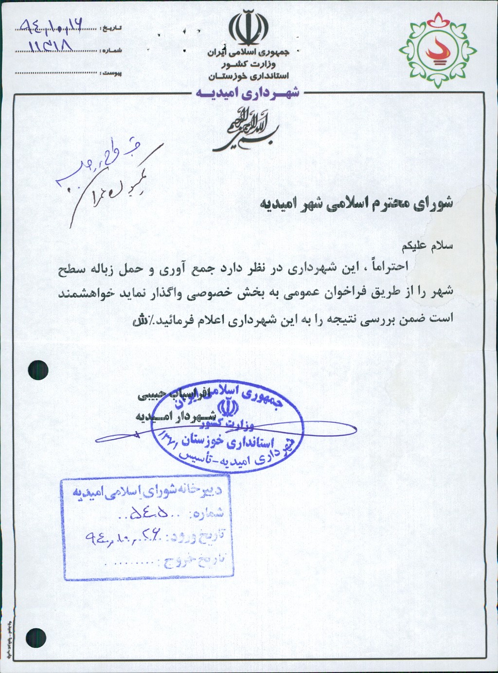 مصوبه شماره ۵ جلسه شماره ۹۳ مورخ ۹۴/۱۱/۱۳ شورای اسلامی شهر امیدیه