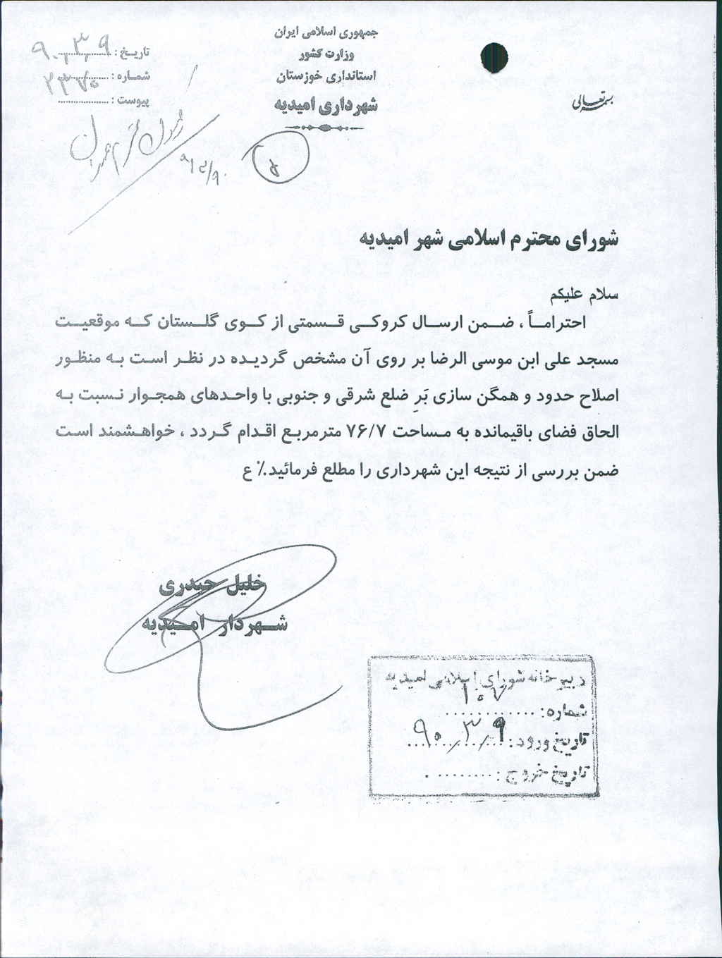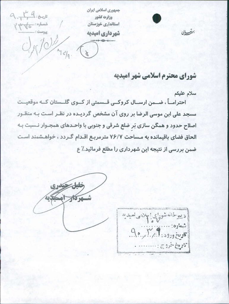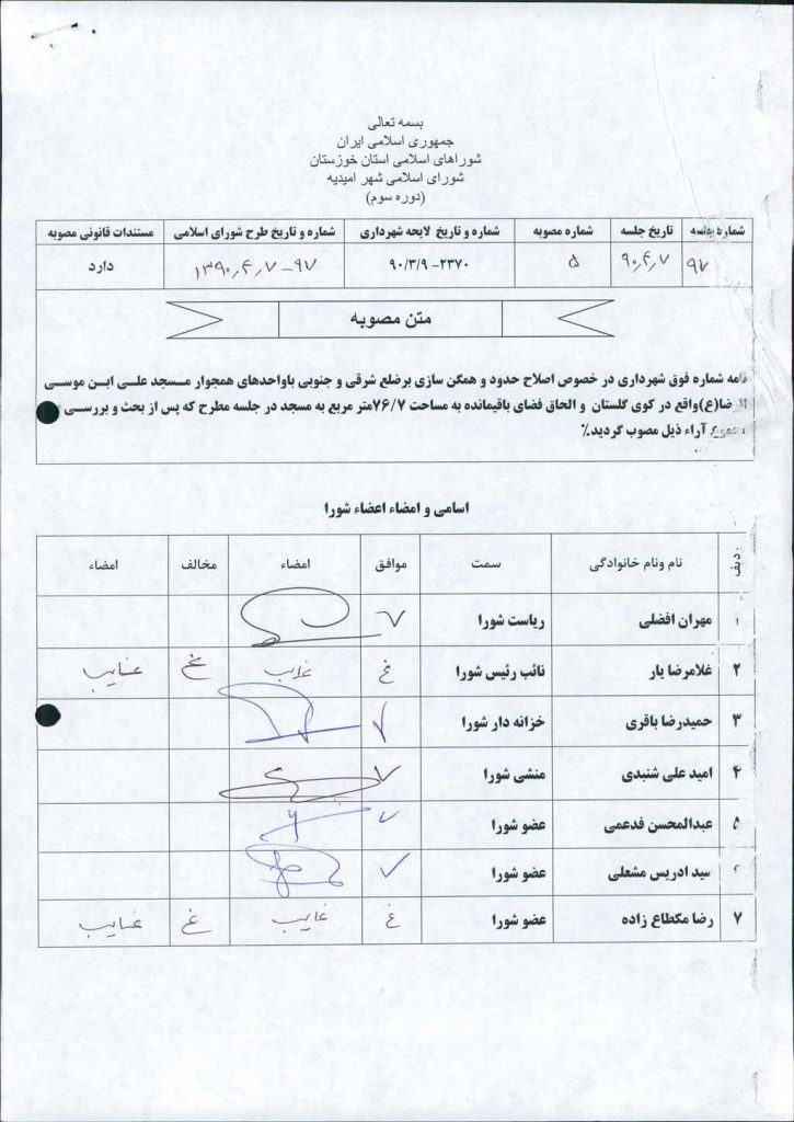 نامه شماره فوق شهرداری در خصوص اصلاح حدود و همگن سازی برضلع شرقی و جنوبی باواحدهای همجوار مسجد علی ابن موسی الرضا(ع)واقع در کوی گلستان و الحاق فضای باقیمانده به مساحت ۷/ ۷۶متر مربع به مسجد در جلسه مطرح که پس از بحث و بررسی با مجموع آراء ذیل مصوب گردید%