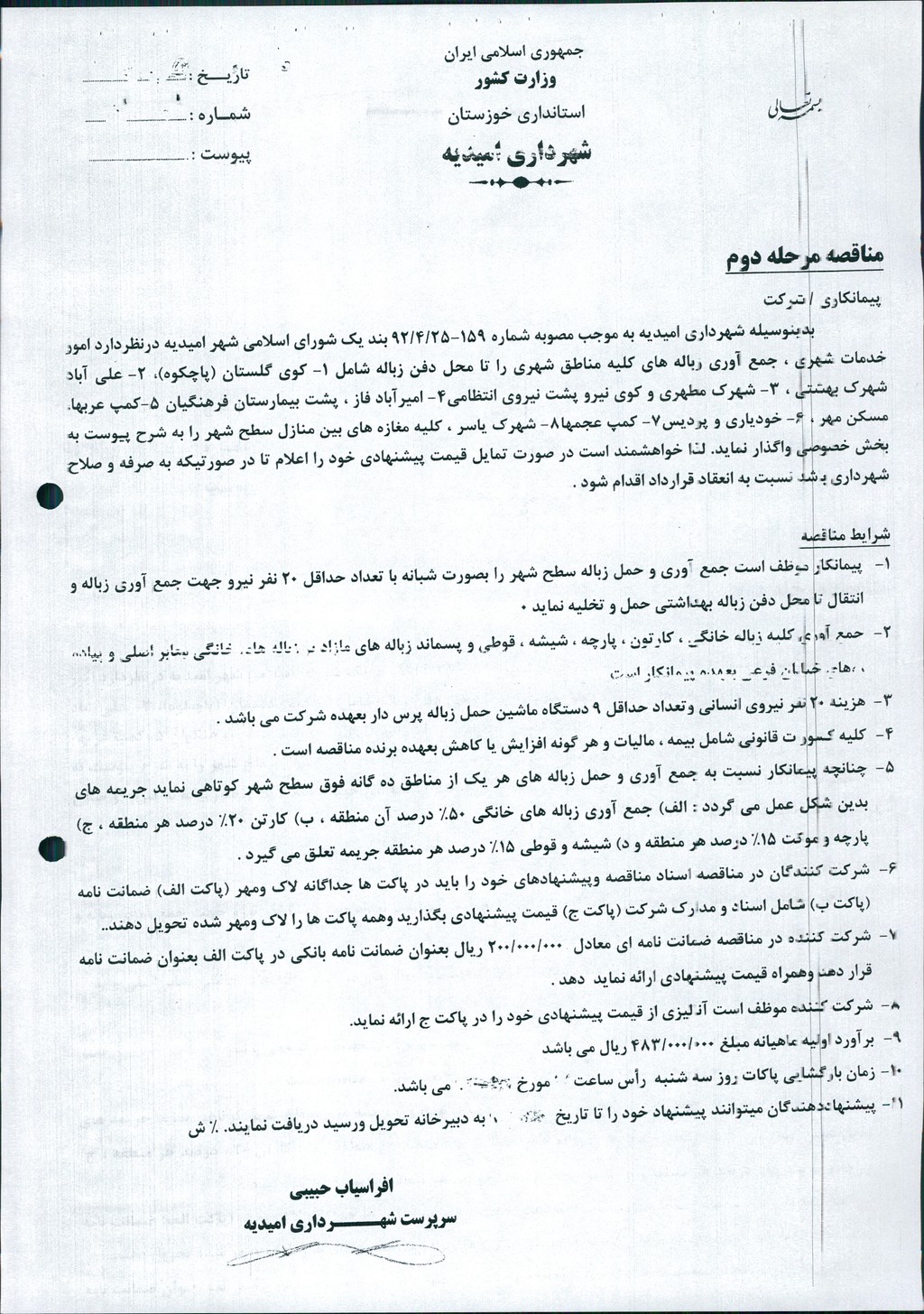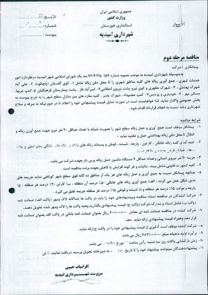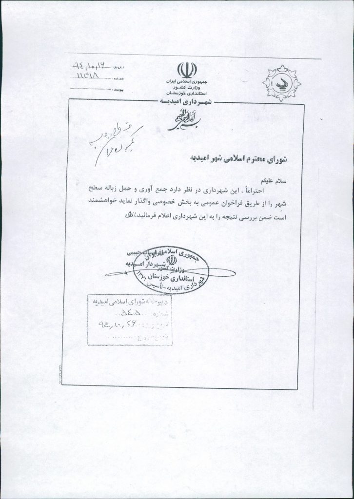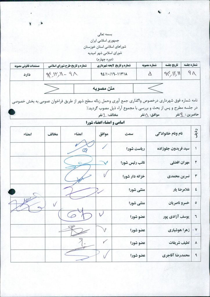 مصوبه شماره ۵ جلسه شماره ۹۸ شورای اسلامی شهر امیدیه