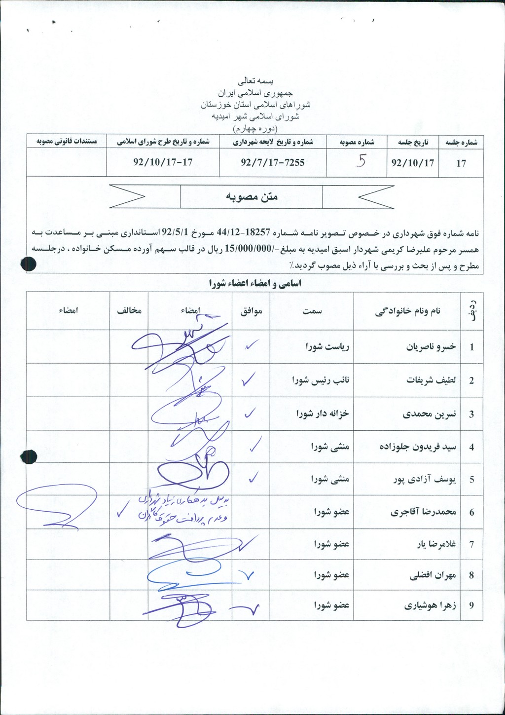 مصوبه شماره ۵ جلسه شماره ۱۷ شورای اسلامی شهر امیدیه