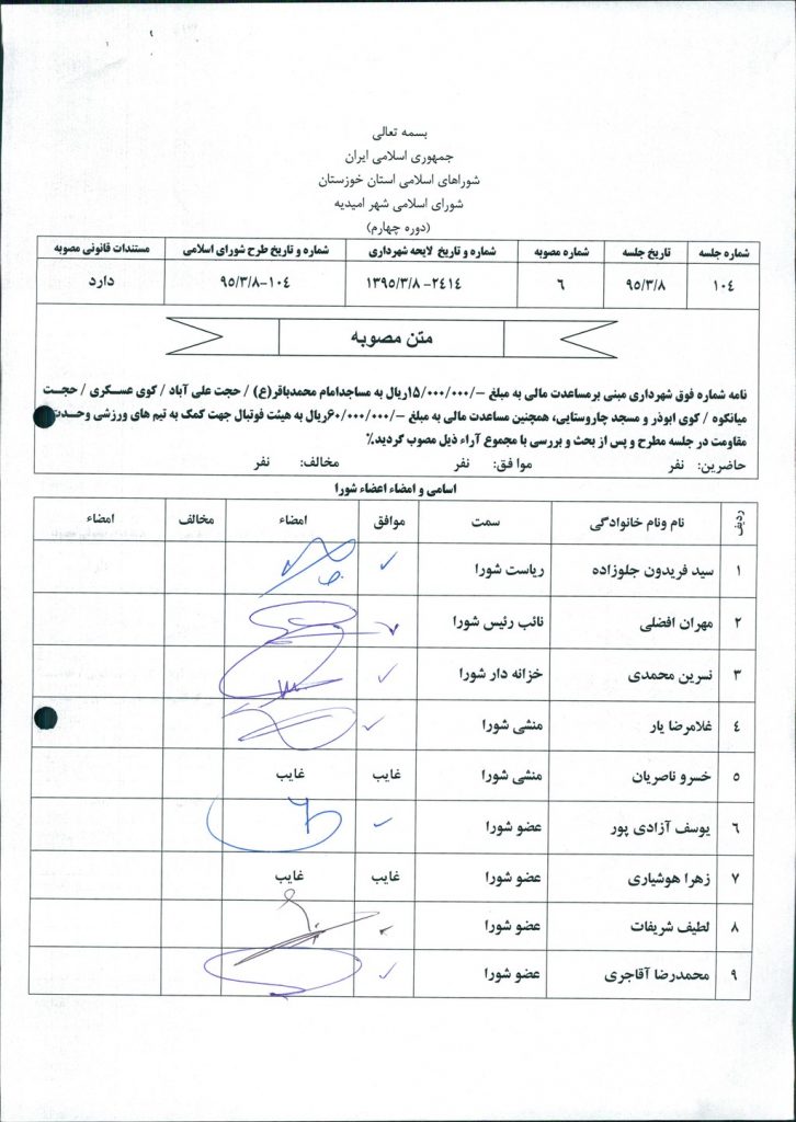 مصوبه شماره ۶ جلسه شماره ۱۰۴ شورای اسلامی شهر امیدیه