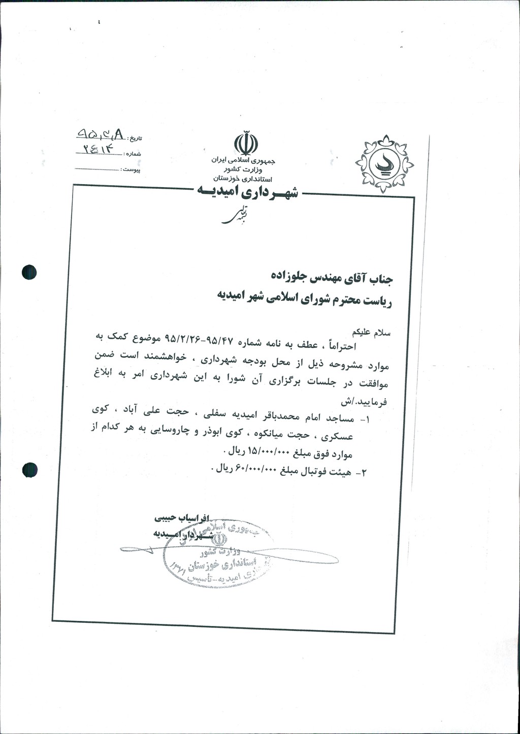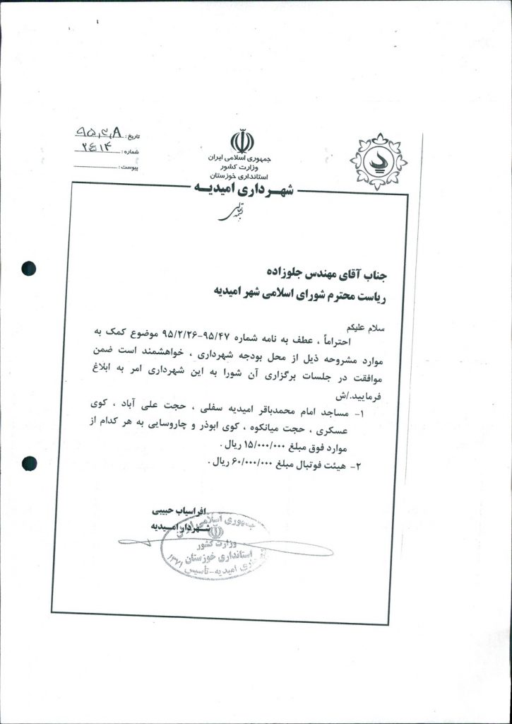 نامه شماره فوق شهرداری مبنی برمساعدت مالی به مبلغ ۱۵۰۰۰۰۰۰ ريال به مساجدامام محمدباقر(ع) / حجت علی آباد / کوی عسکری / حجت میانکوه/کوی ابوذر و مسجد چاروسایی، همچنین مساعدت مالی به مبلغ ۶۰۰۰۰۰۰۰ ريال به هیئت فوتبال جهت کمک به تیم های ورزشی وحدت و مقاومت در جلسه مطرح و پس از بحث و بررسی با مجموع آراء ذیل مصوب گردید%
