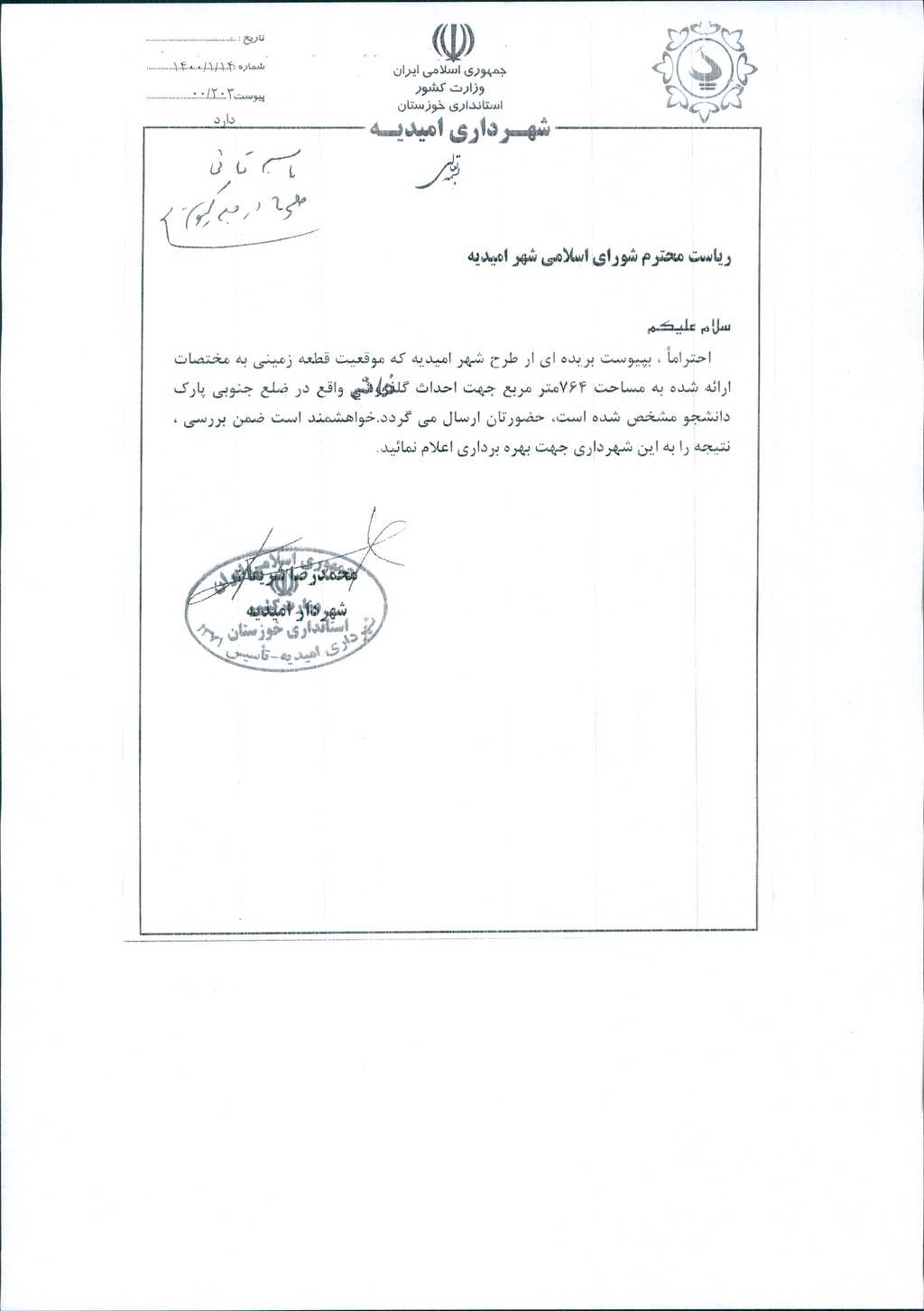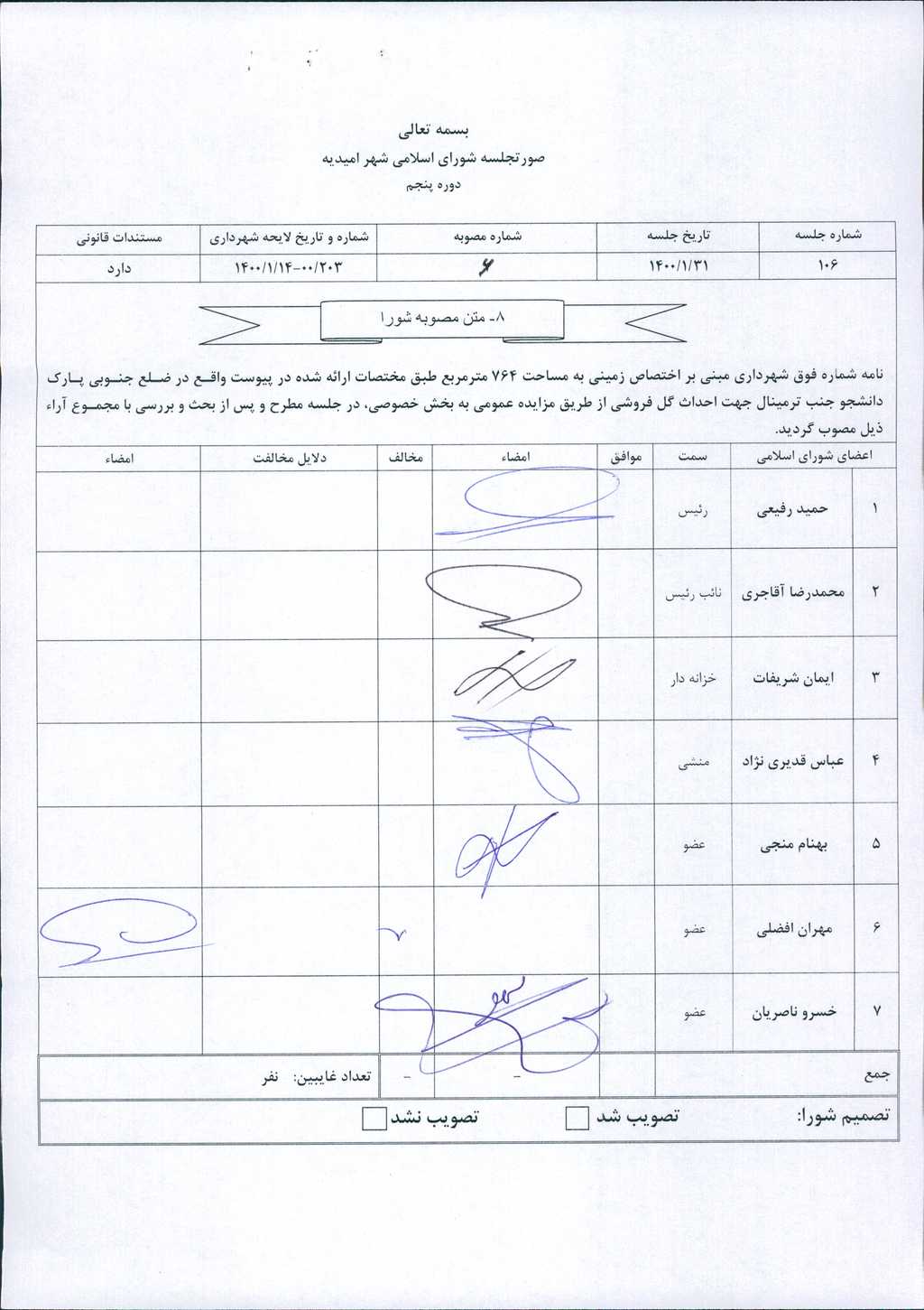مصوبه شماره ۶ جلسه شماره ۱۰۶ شورای اسلامی شهر امیدیه