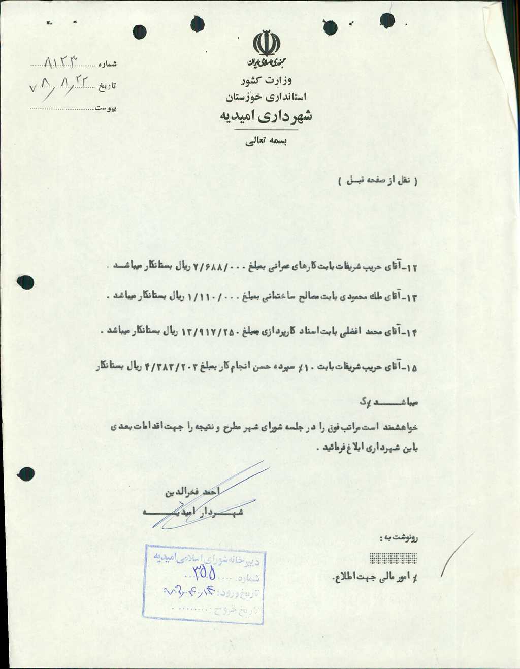 مصوبه شماره ۶ جلسه شماره ۱۱۰ شورای اسلامی شهر امیدیه
