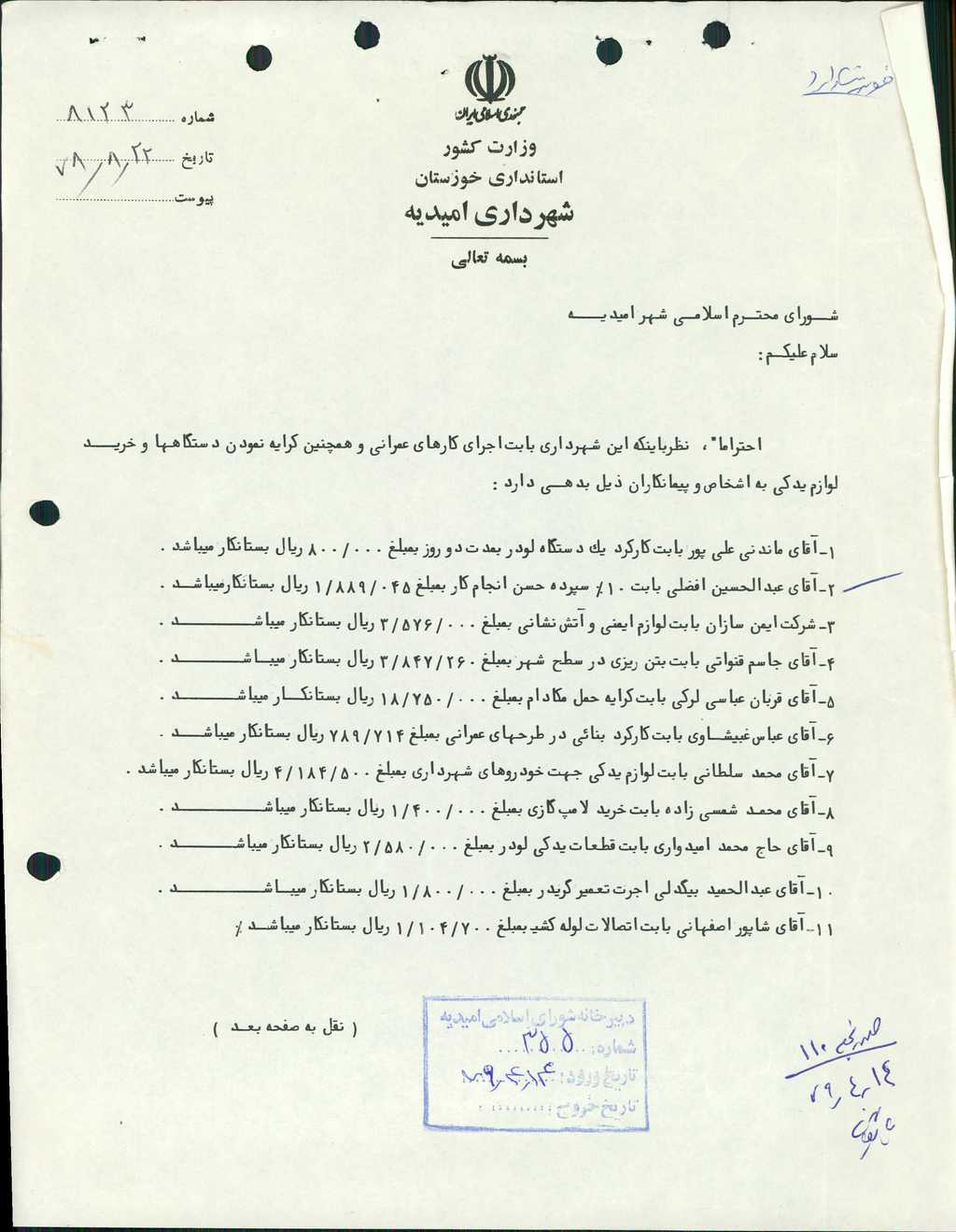 ۶-نامه شماره ۸۱۲۳ مورخ ۲۲/ ۸/ ۷۸ در خصوص بدهي شهرداري بابت اجراي كارهاي عمراني و همچنين كرايه نمودن دستگاهها و خريد لوازم يدكي به اشخاص و پيمانكاران كه داراي ۱۵بند بود مطرح و با تعداد ۷رأي موافق مقرر گرديد كه شهرداري مساعدت مورد نظر را انجام دهد.
