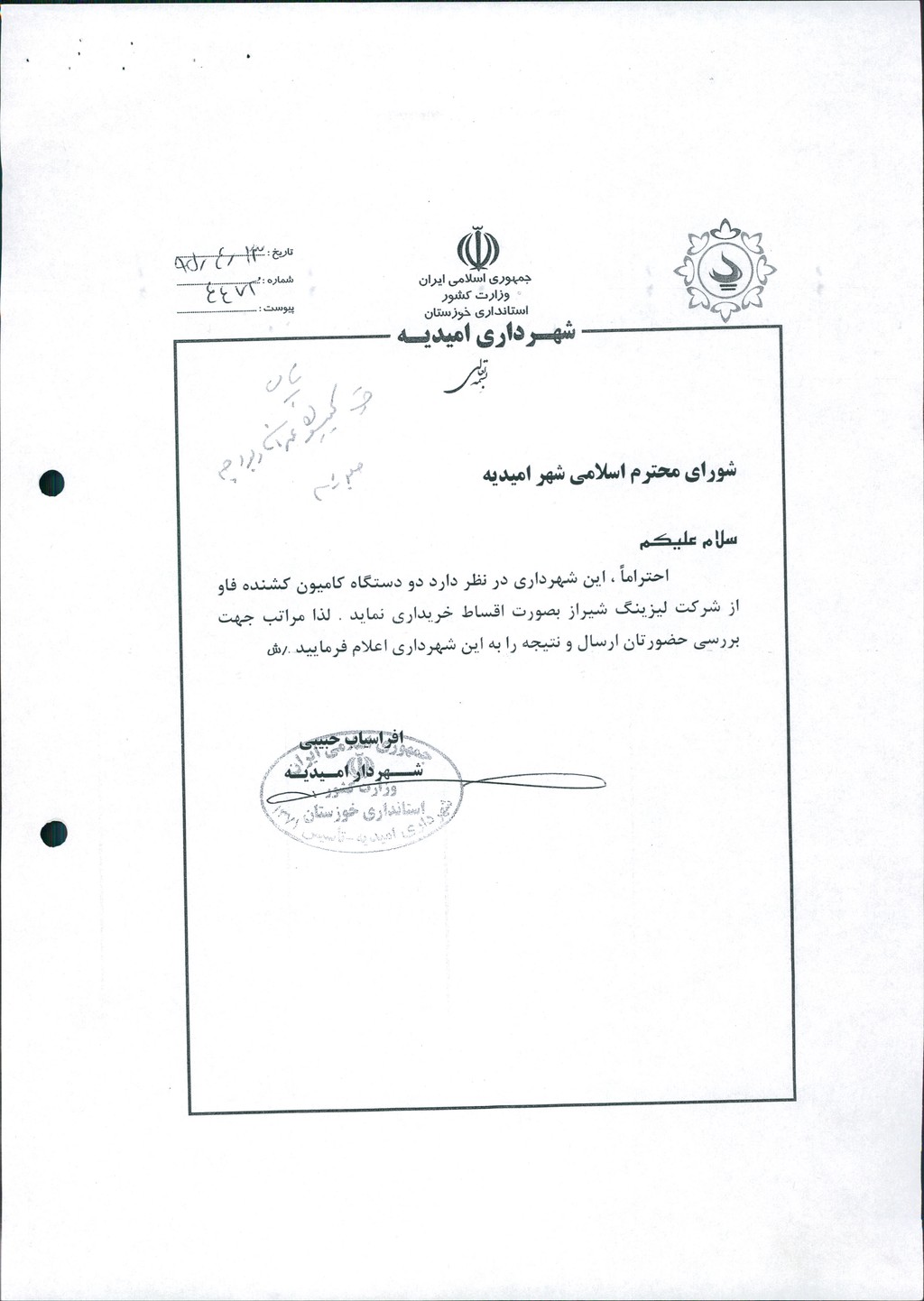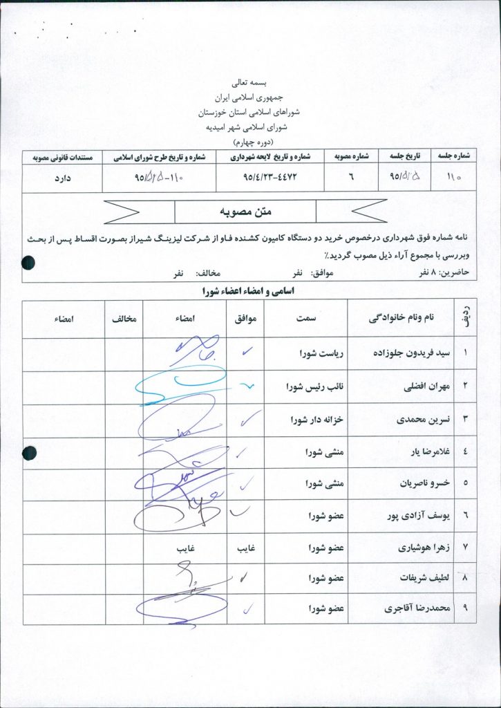 نامه شماره فوق شهرداری در خصوص خرید دو دستگاه کامیون کشنده فاو از شرکت لیزینگ شیراز بصورت اقساط در جلسه مطرح و پس از بحث و بررسی با مجموع آراء ذیل مصوب گردید%