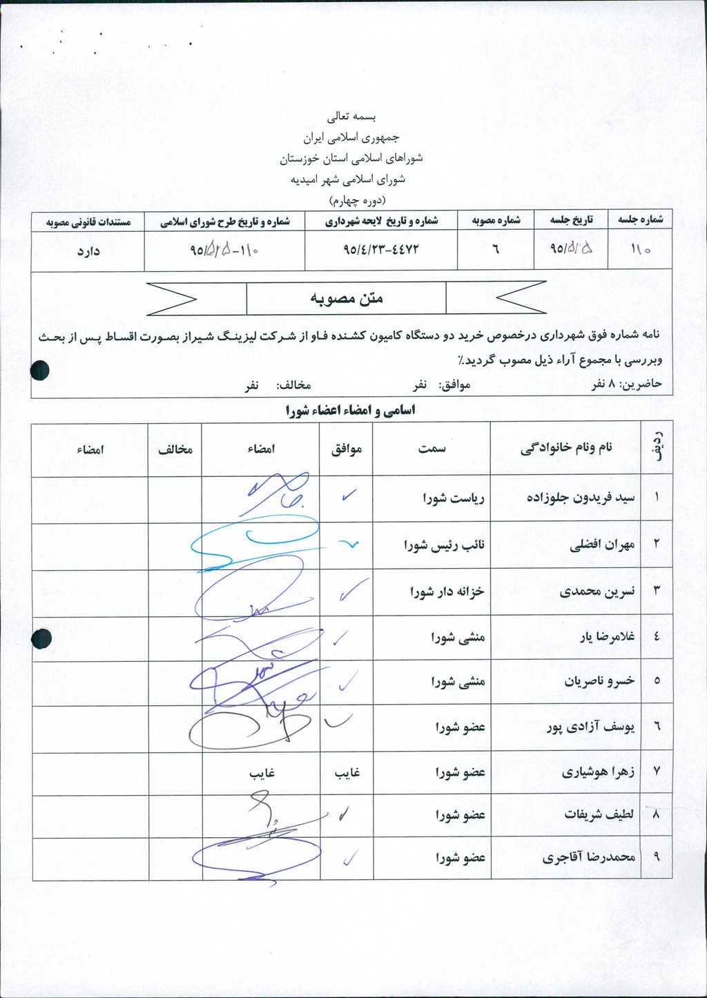 مصوبه شماره ۶ جلسه شماره ۱۱۰ شورای اسلامی شهر امیدیه
