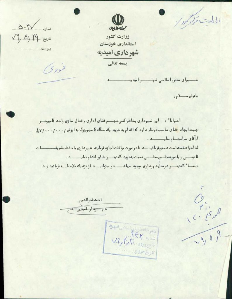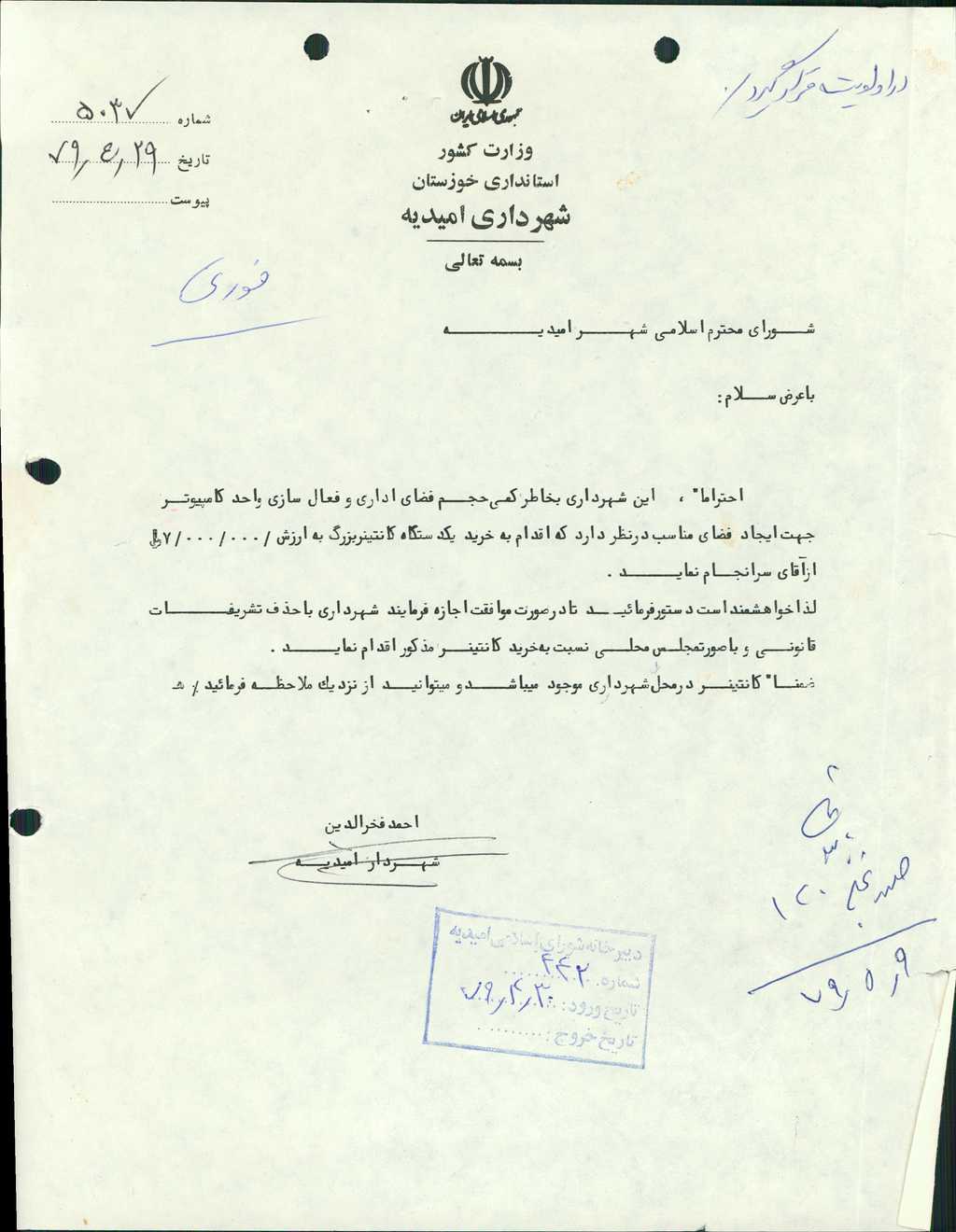 ۶-نامه شهرداري ۵۰۳۷ مورخه ۲۹/ ۴/ ۷۹ در رابطه با كمي حجم فضاي اداري و فعال سازي واحد كامپيوتر جهت ايجاد فضاي مناسب در نظر دارد يكدستگاه كاروان بزرگ به ارزش -/۰۰۰/۰۰۰/ ۷ ريال با حذف تشريفات قانوني خريداري نمايد مطرح و با تعداد ۶ رأي موافق مقرر گرديد شهرداري اقدام نمايد.