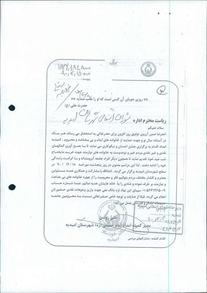 نامه شماره فوق شهرداری در خصوص درخواست کمیته امداد امام خمینی (ره) مبنی بر مساعدت مالی به مبلغ بیست میلیون (-/۰۰۰/۰۰۰/ ۲۰ )ریـال جهت جشن نیکوکاری در جلسه مطرح و پس از بحث و بررسی با مجموع آراء ذیل مصوب گردید%