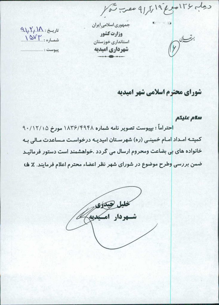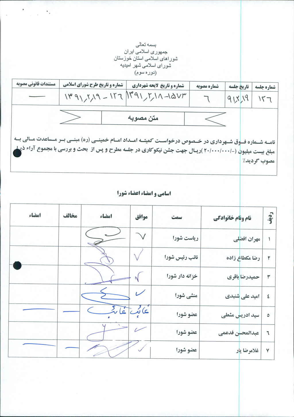 مصوبه شماره ۶ جلسه شماره ۱۲۶ شورای اسلامی شهر امیدیه