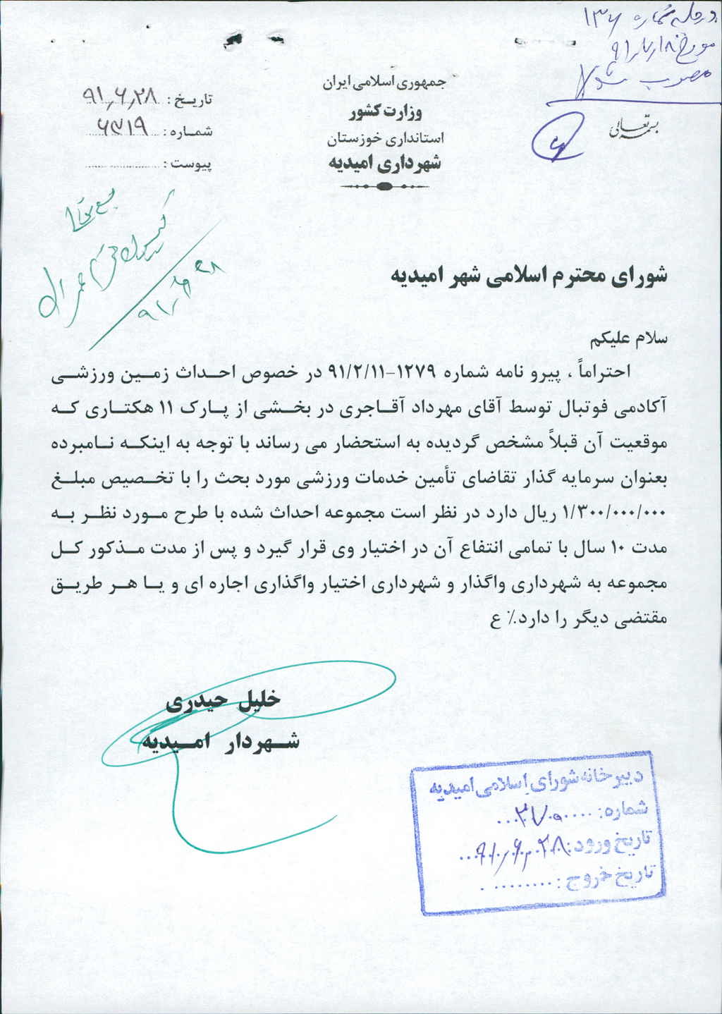 نامه شماره فوق شهرداری در خصوص احداث و راه اندازی آکادمی فوتبال در پارک ۱۱ هکتاری که در نظر است مجموعه به مدت ده (۱۰) سال در اختیار متقاضیان واجد شرایط قرار گیرد و پس از آن شهرداری در خصوص اجاره به غیر مختار می باشد مطرح و با مجموع آراء ذیل مصوب گردید%