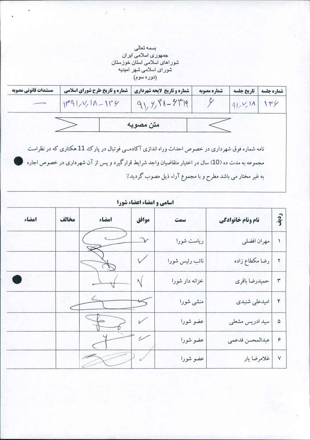 مصوبه شماره ۶ جلسه شماره ۱۳۶ مورخ ۹۱/۷/۱۸ شورای اسلامی شهر امیدیه
