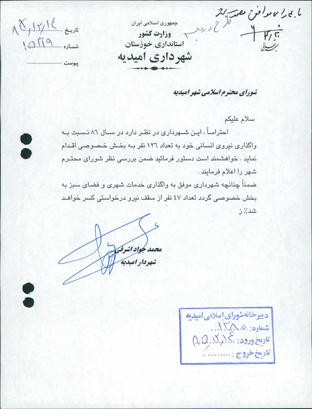 ۶-نامه شماره ۱۵۳۱۹مورخ۱۴/ ۱۲/ ۸۵شهرداري درخصوص واگذاري نيروي انساني بتعداد ۱۲۶نفر به بخش خصوصي مطرح وبا ۴رأي موافق به تصويب رسيد.
