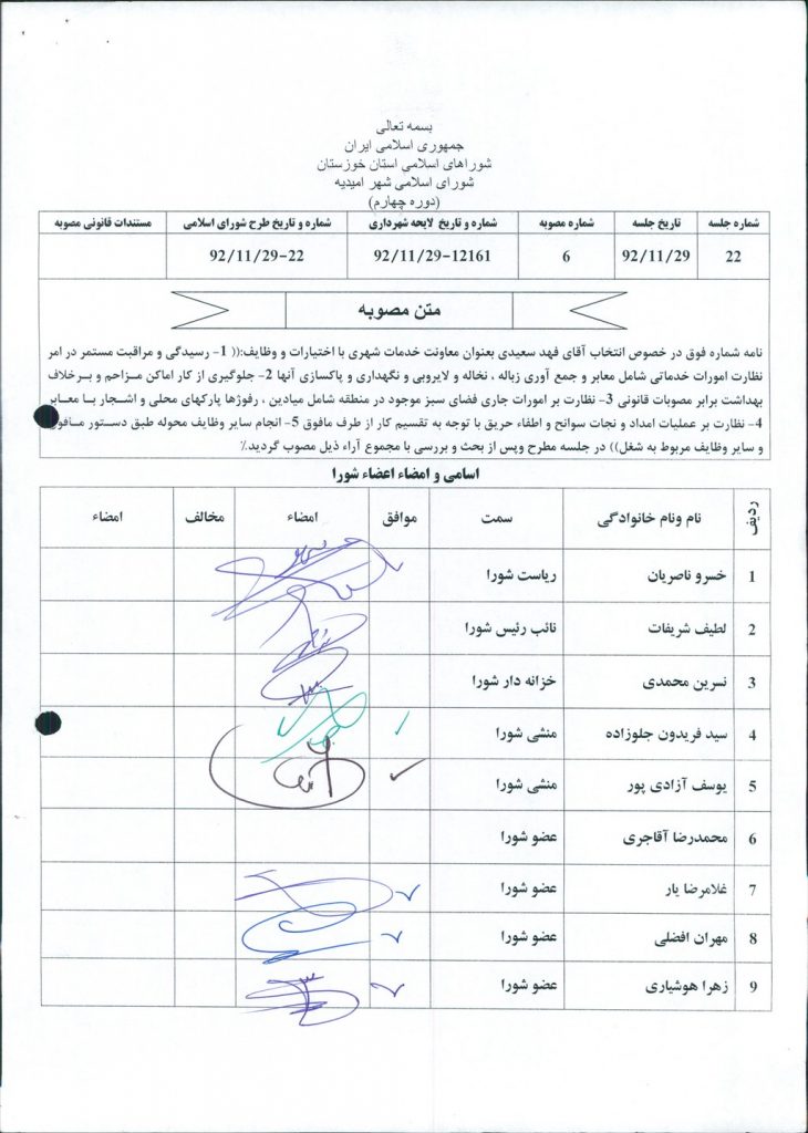 مصوبه شماره ۶ جلسه شماره ۲۲ شورای اسلامی شهر امیدیه