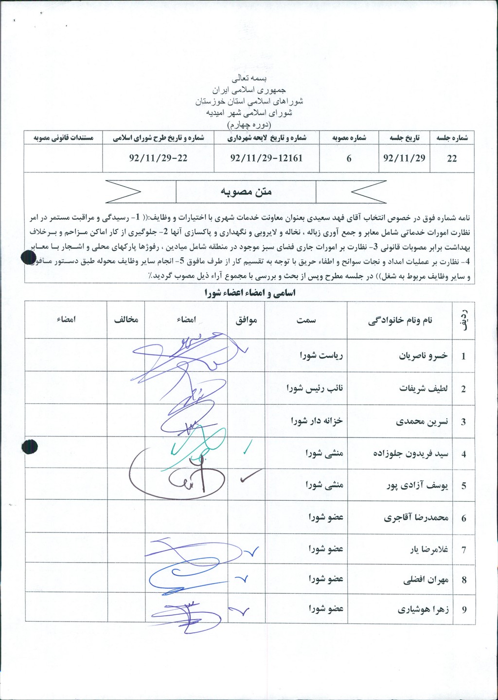 نامه شماره فوق در خصوص انتخاب آقای فهد سعیدی بعنوان معاونت خدمات شهری با اختیارات و وظایف:(( ۱- رسیدگی و مراقبت مستمر در امر نظارت امورات خدماتی شامل معابر و جمع آوری زباله ، نخاله و لایروبی و نگهداری و پاکسازی آنها ۲- جلوگیری از کار اماکن مزاحم و برخلاف بهداشت برابر مصوبات قانونی ۳- نظارت بر امورات جاری فضای سبز موجود در منطقه شامل میادین ، رفوژها پارکهای محلی و اشجار با معابر ۴- نظارت بر عملیات امداد و نجات سوانح و اطفاء حریق با توجه به تقسیم کار از طرف مافوق ۵- انجام سایر وظایف محوله طبق دستور مافوق و سایر وظایف مربوط به شغل)) در جلسه مطرح وپس از بحث و بررسی با مجموع آراء ذیل مصوب گردید%
