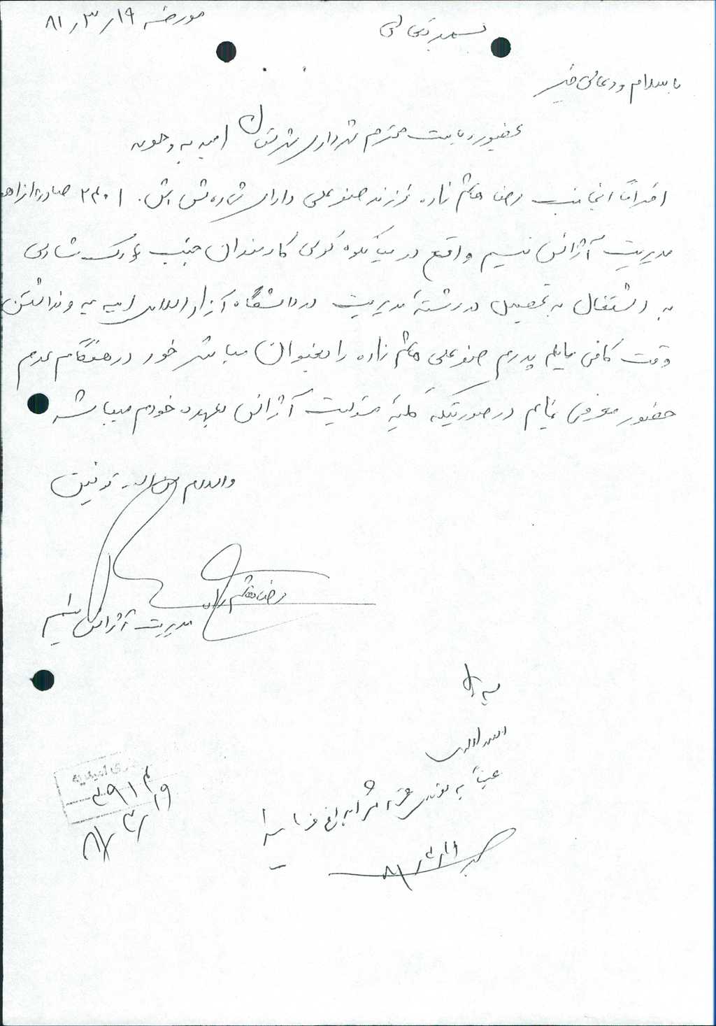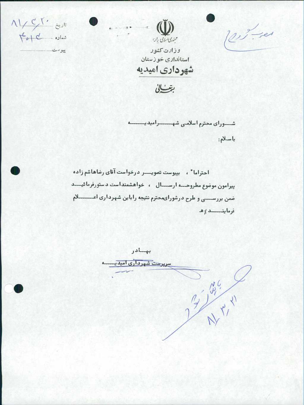 ۶-نامه شماره۴۰۱۲مورخه۲۰/ ۳/ ۸۱شهرداري درخصوص درخواست آقاي رضاهاشم زاده مديرآژانس نسيم مبني برمعرفي آقاي صفرعلي هاشم زاده به عنوان مباشر خود در هنگام عدم حضور ايشـان درآژانس پس از بحث وبررسي با ۶رأي موافق به تصويب رسيـد.