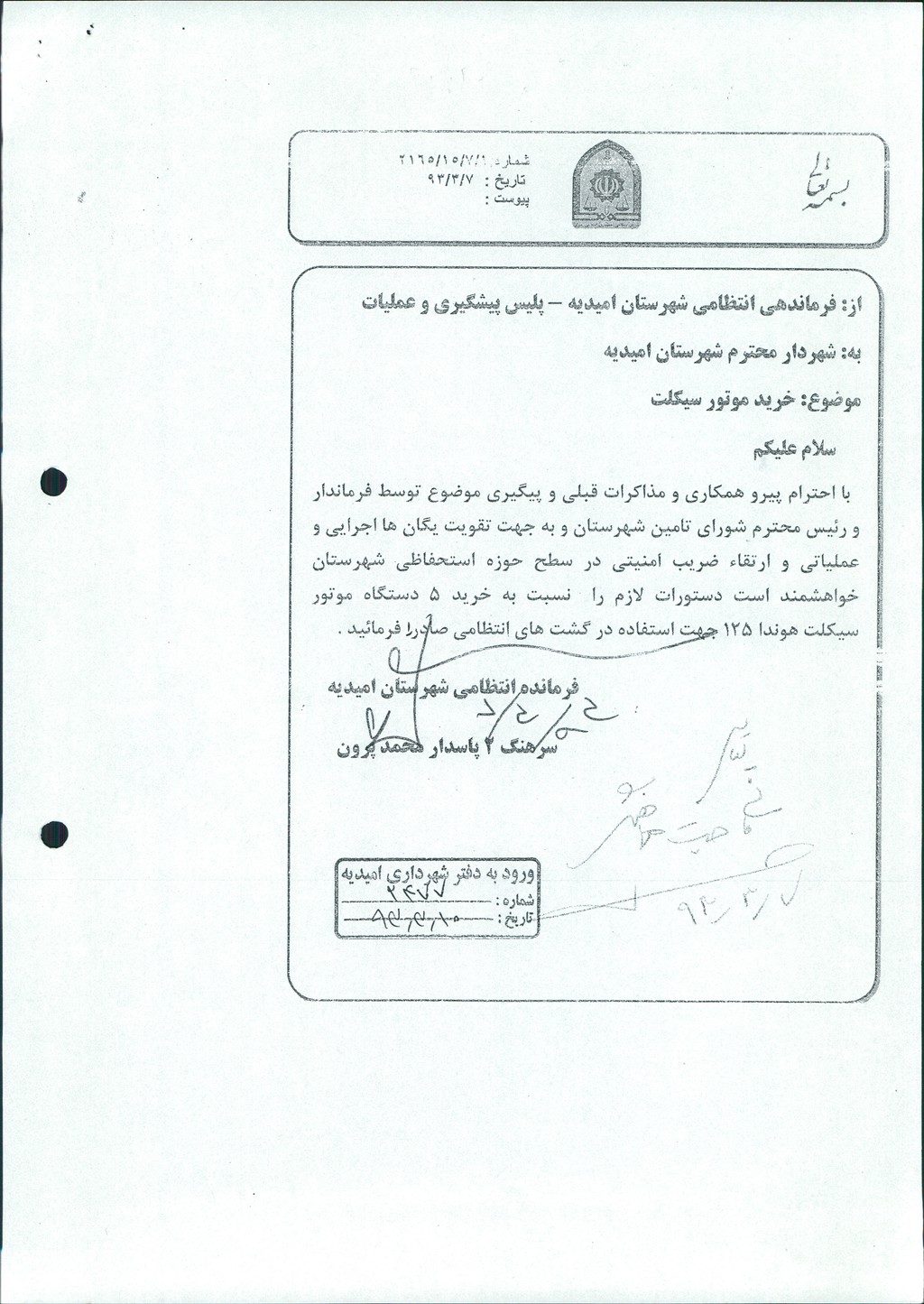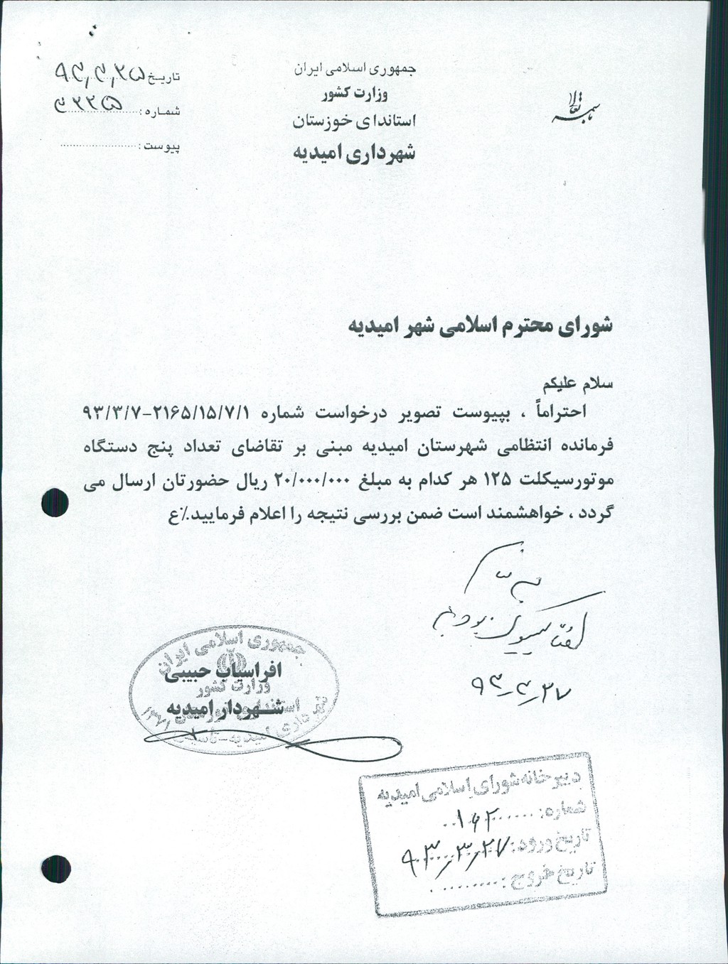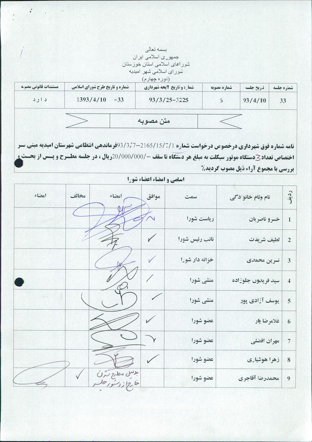نامه شماره فوق شهرداری درخصوص درخواست شماره ۱/۷/۱۵/۲۱۶۵-۷/۳/۹۳فرماندهی انتظامی شهرستان امیدیه مبنی بر اختصاص تعداد ۳ دستگاه موتور سیکلت به مبلغ هر دستگاه تا سقف ۲۰۰۰۰۰۰۰ ريال ، در جلسه مطرح و پس از بحث و بررسی با مجموع آراء ذیل مصوب گردید%