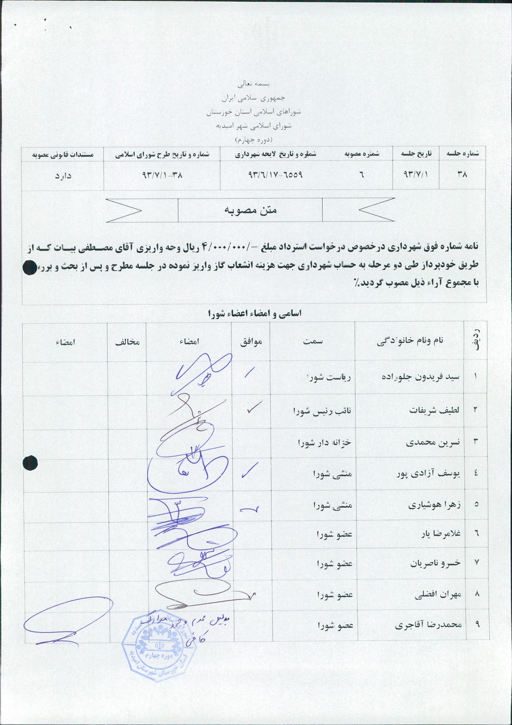 مصوبه شماره ۶ جلسه شماره ۳۸ شورای اسلامی شهر امیدیه