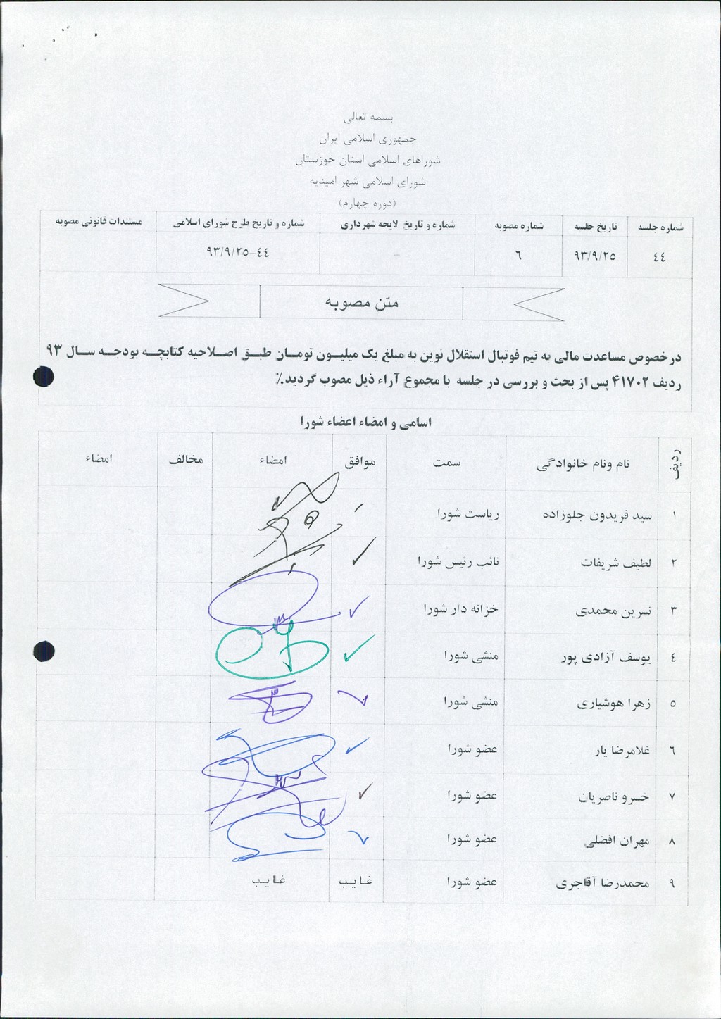 مصوبه شماره ۶ جلسه شماره ۴۴ مورخ ۹۳/۹/۲۵ شورای اسلامی شهر امیدیه