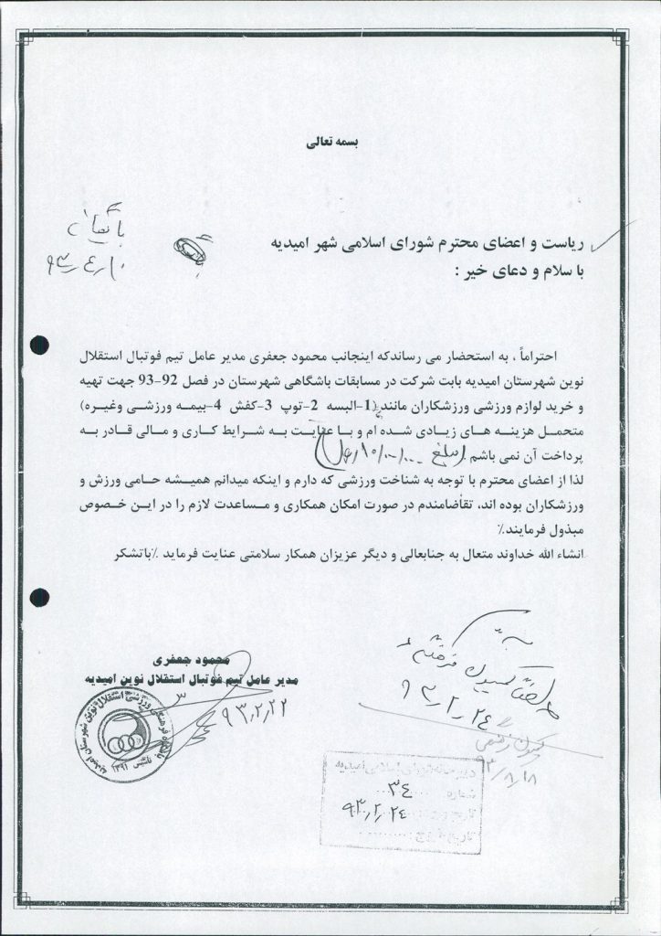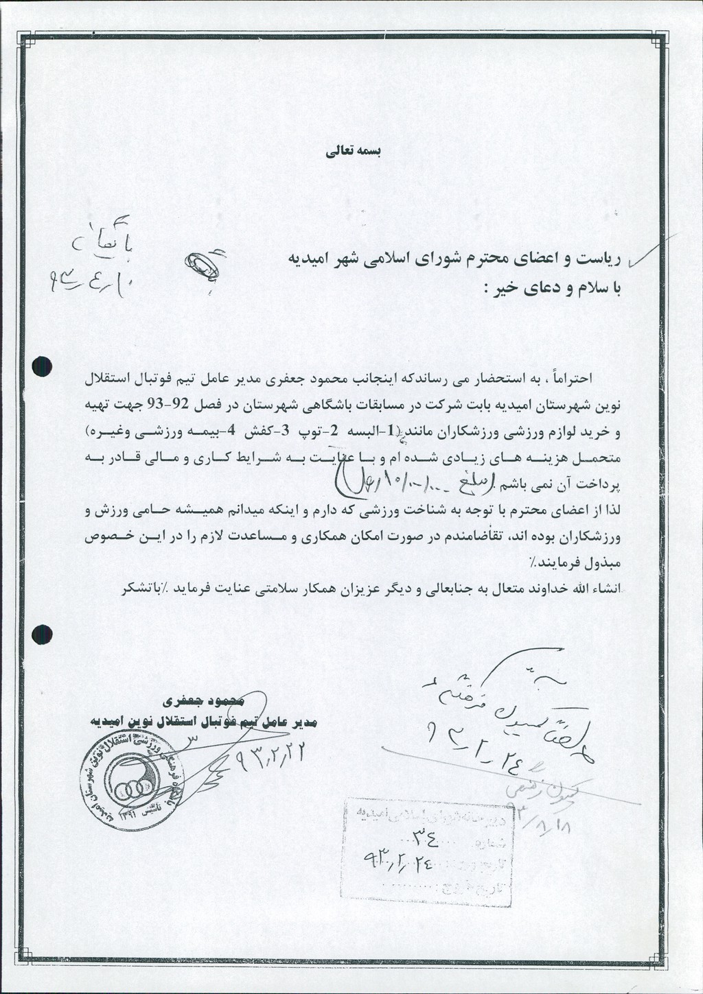درخصوص مساعدت مالی به تیم فوتبال استقلال نوین به مبلغ یک میلیون تومان طبق اصلاحیه کتابچه بودجه سال ۹۳ ردیف ۴۱۷۰۲ پس از بحث و بررسی در جلسه  با مجموع آراء ذیل مصوب گردید%