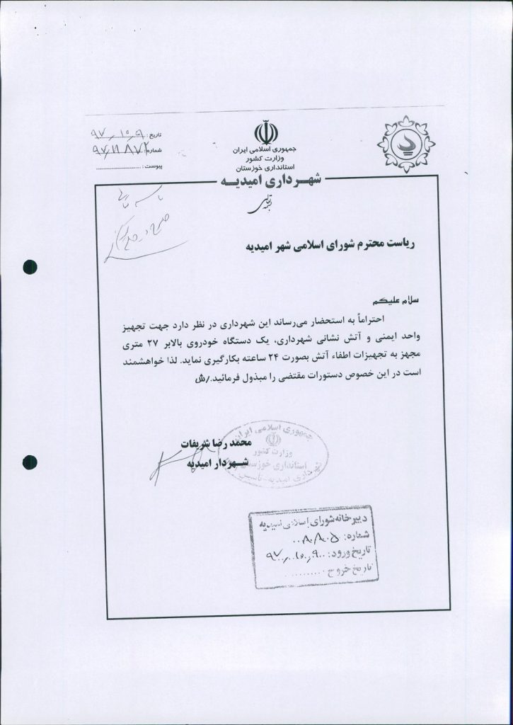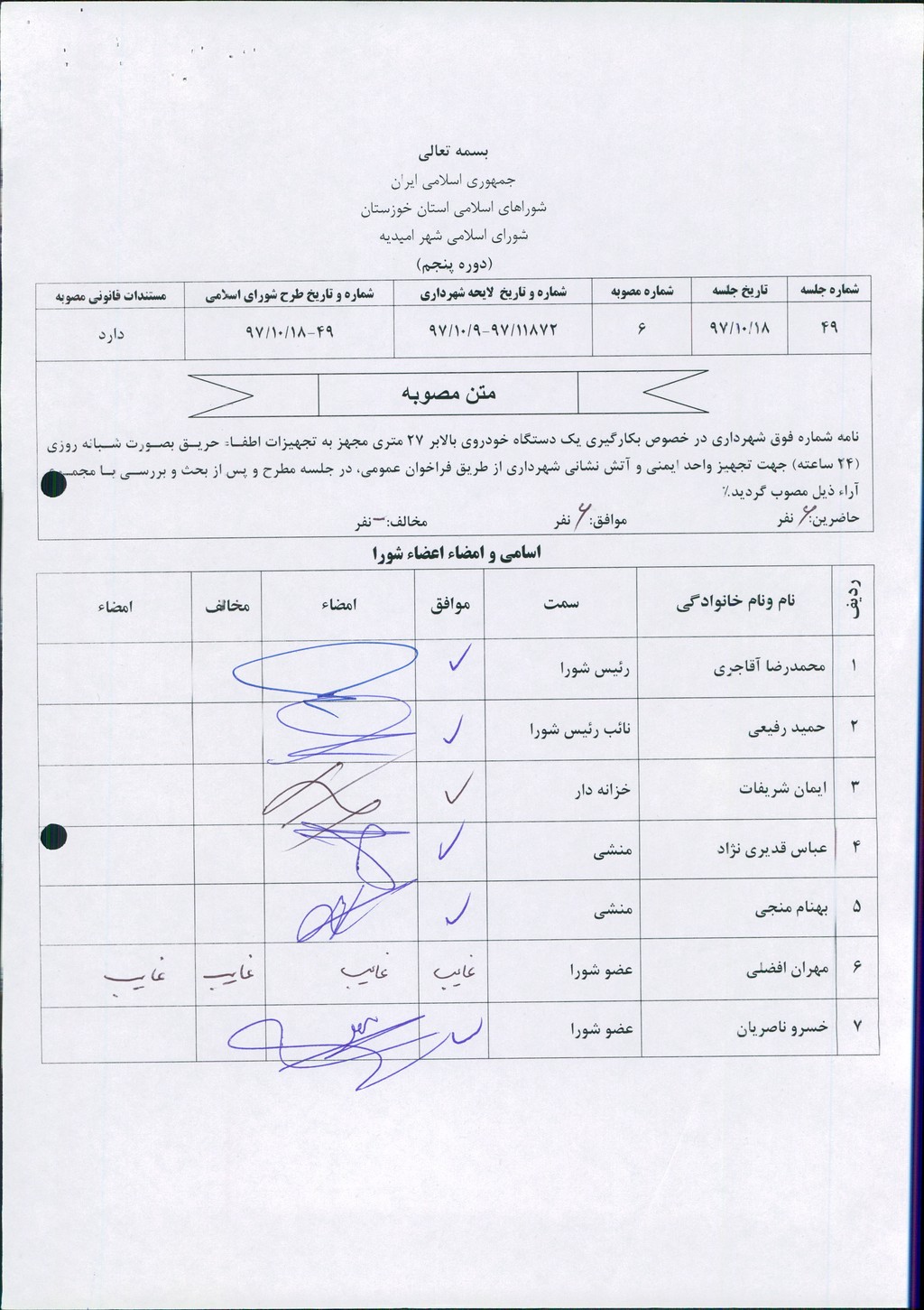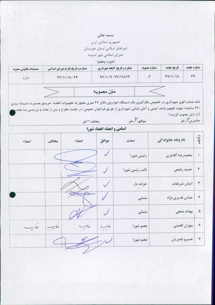 مصوبه شماره ۶ جلسه شماره ۴۹ مورخ ۹۷/۱۰/۱۸ شورای اسلامی شهر امیدیه