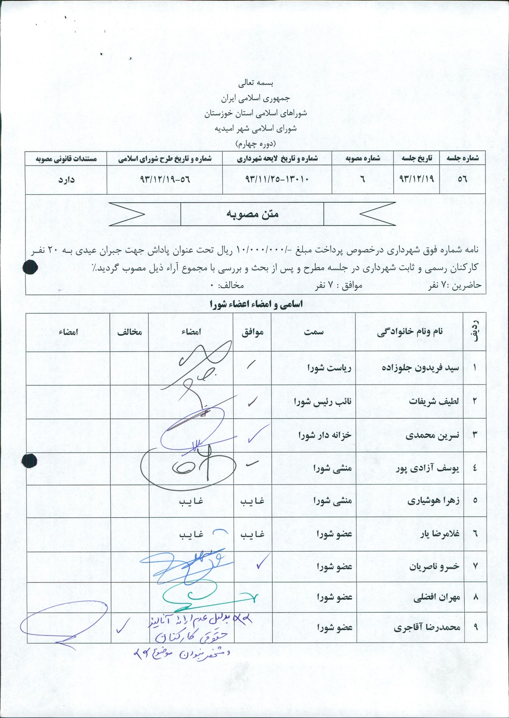 مصوبه شماره ۶ جلسه شماره ۵۶ شورای اسلامی شهر امیدیه