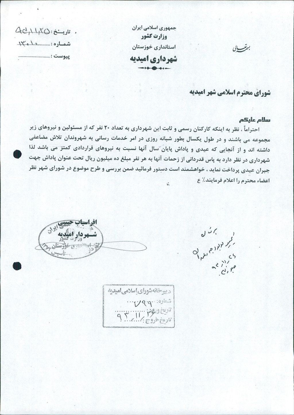 نامه شماره فوق شهرداری درخصوص پرداخت پاداش جهت جبران عیدی به تعداد۲۰ نفر و به ازای هر نفر مبلغ ۱۰۰۰۰۰۰۰ریال به کارکنان رسمی و ثابت شهرداری در جلسه مطرح و پس از بحث و بررسی با مجموع آراء ذیل مصوب گردید%