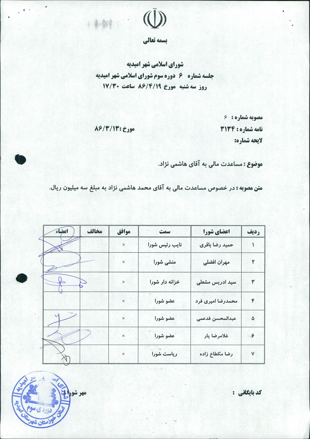 متن مصوبه : در خصوص مساعدت مالي به آقاي محمد هاشمي نژاد به مبلغ سه ميليون ريال.
