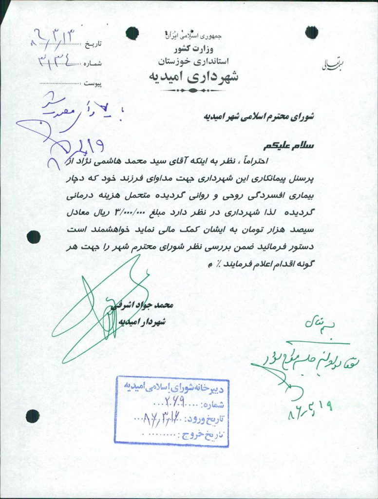 موضوع : مساعدت مالي به آقاي هاشمي نژاد.