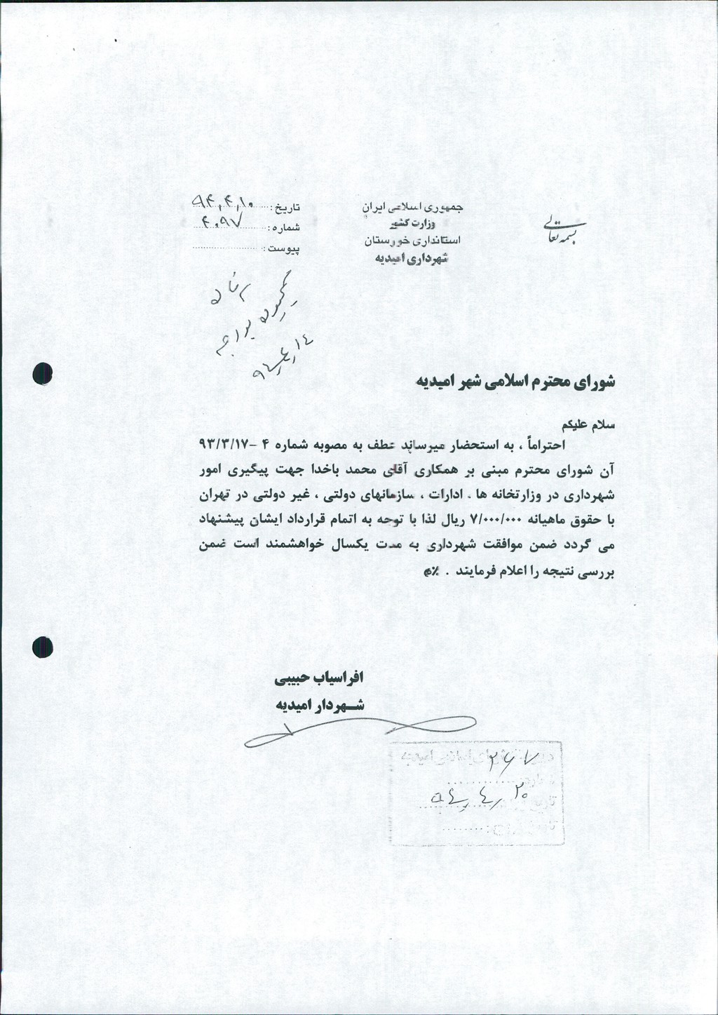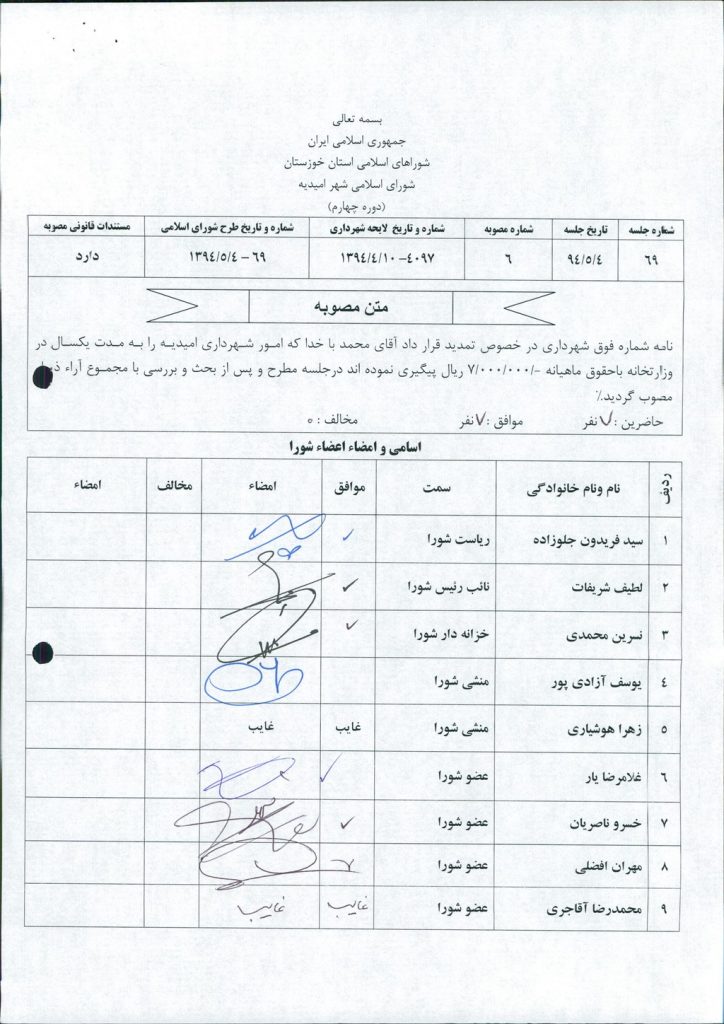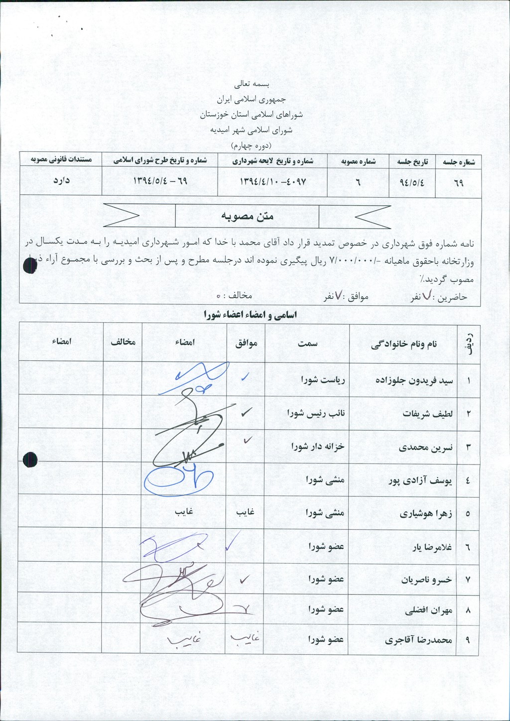 نامه شماره فوق شهرداری در خصوص تمدید قرار داد آقای محمد باخدا که امور شهرداری امیدیه را به مدت یکسال در وزارتخانه باحقوق ماهیانه ۷۰۰۰۰۰۰ ریال پیگیری نموده اند درجلسه مطرح و پس از بحث و بررسی با مجموع آراء ذیل مصوب گردید%