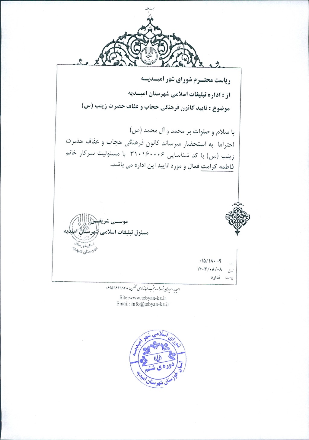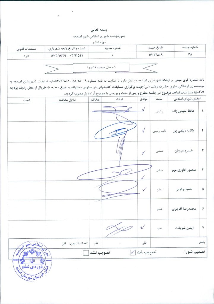 مصوبه شماره ۶ جلسه شماره ۷۸ شورای اسلامی شهر امیدیه