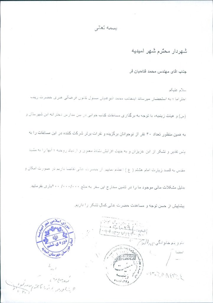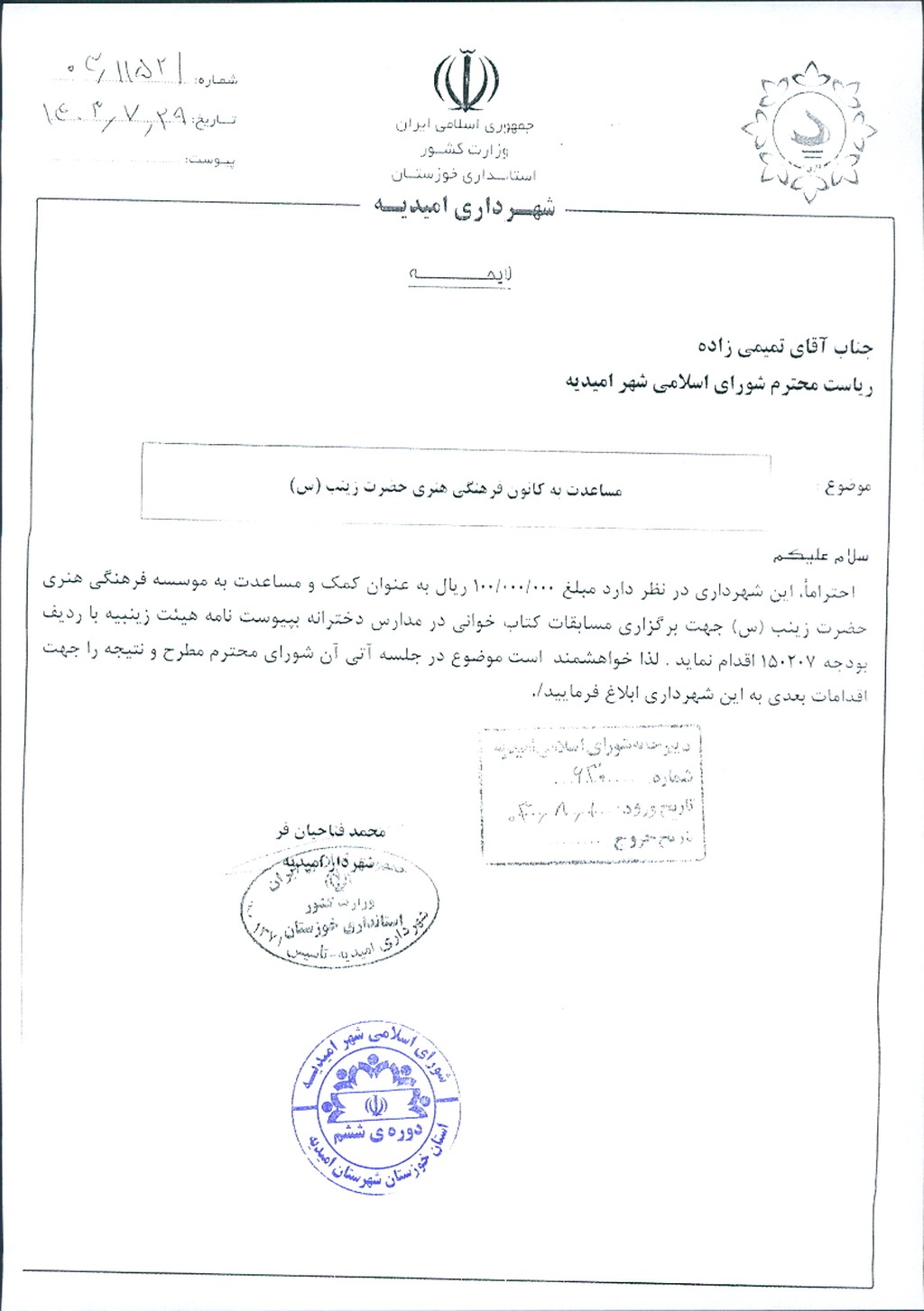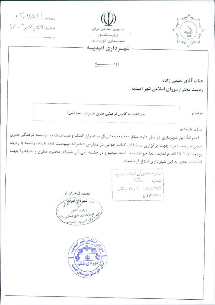 نامه شماره فوق مبنی بر اینکه شهرداري امیدیه در نظر دارد با عنایت به نامه شماره ۹-۱۸۰/ ۰۱۵-۸/۸/ ۱۴۰۳ اداره تبلیغات شهرستان امیدیه به موسسه ی فرهنگی هنری حضرت زینب (س)جهت برگزاری مسابقات کتابخوانی در مدارس دخترانه به مبلغ ۰۰۰/۰۰۰/ ۱۰۰ریال از محل ردیف بودجه ۱۵۰۲۰۷ مساعدت نماید، موضوع در جلسه مطرح و پس از بحث و بررسي با مجموع آراء ذيل مصوب گرديد.