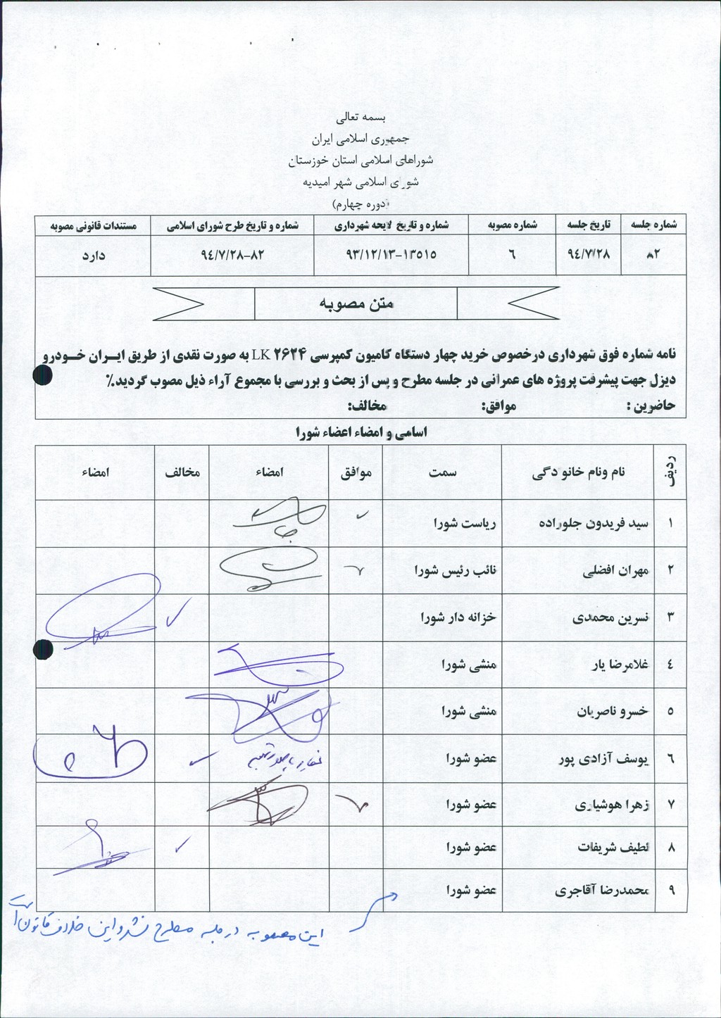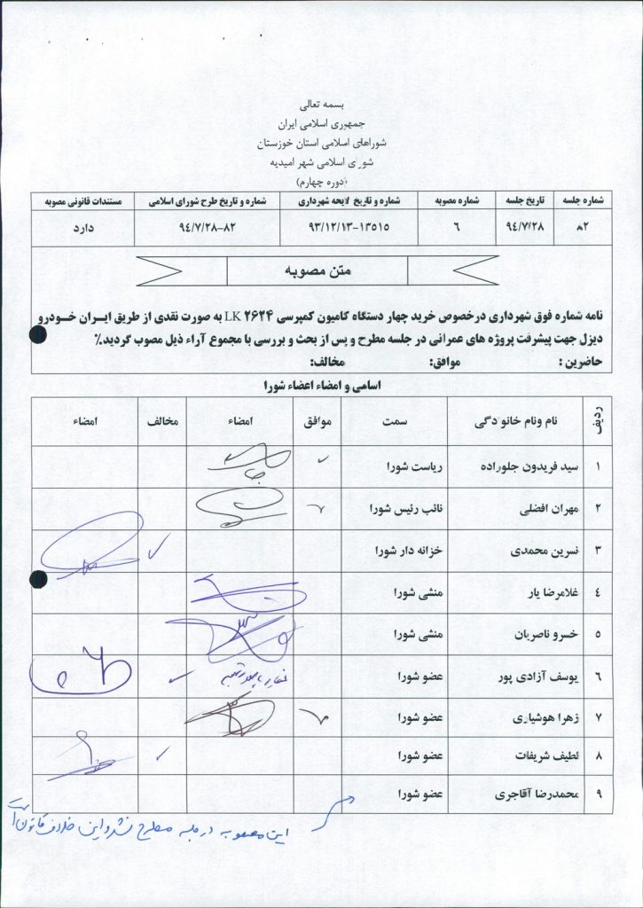 مصوبه شماره ۶ جلسه شماره ۸۲ شورای اسلامی شهر امیدیه