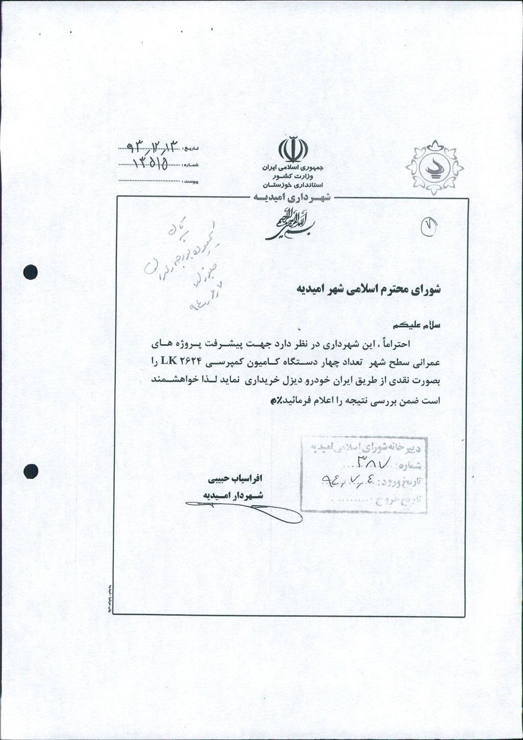 نامه شماره فوق شهرداری درخصوص خرید چهار دستگاه کامیون کمپرسی ۲۶۲۴ LK به صورت نقدی از طریق ایران خودرو دیزل جهت پیشرفت پروژه های عمرانی در جلسه مطرح و پس از بحث و بررسی با مجموع آراء ذیل مصوب گردید%