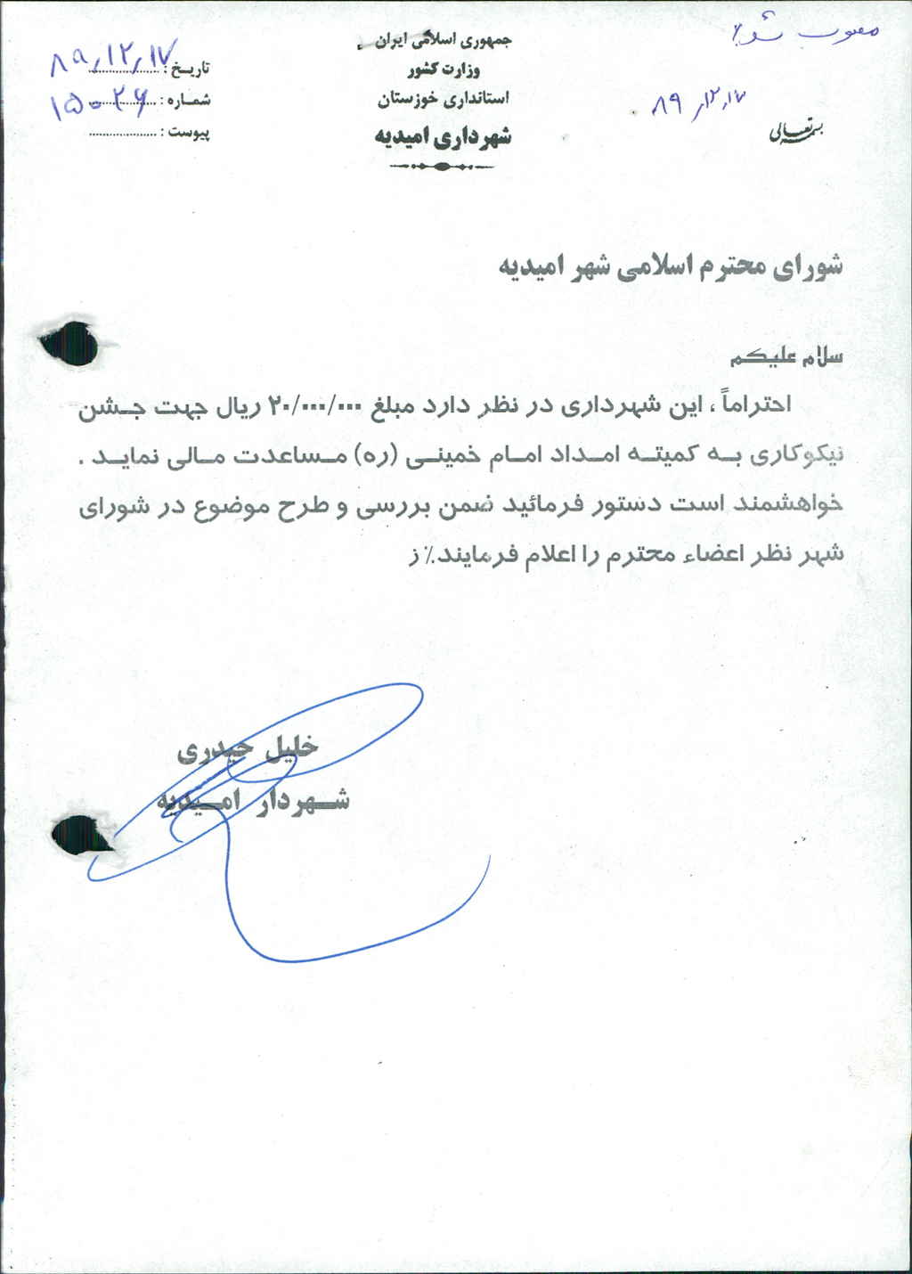 نامه شماره فوق شهرداری مبنی بر درخواست کمیته امداد امام خمینی (ره) شهرستان در خصوص مساعدت مالی به مبلغ -/۰۰۰/۰۰۰/ ۲۰ ریال جهت جشن نیکو کاری در جلسه مطرح و پس از بحث و بررسی با مجموع آراء ذیل مصوب گردید%